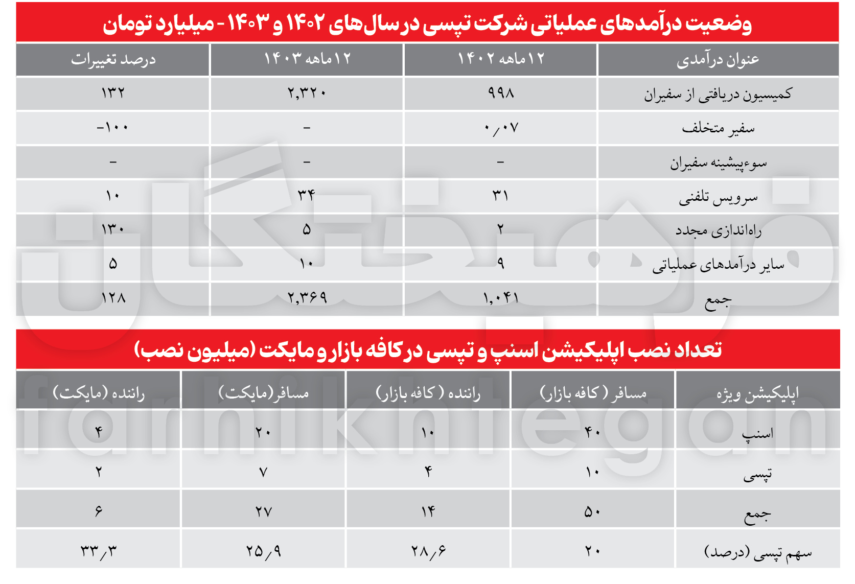 همچنین مجید غنیپور، تحلیلگر حوزه کسبوکار، چند وقت قبل با استناد به دادههای موجود، اعلام کرده که تعداد کل سفرهای تپسی در سال ۱۴۰۳ حدود ۲۰۱ میلیون سفر بوده و در تهران، که روزانه حدود ۴ میلیون سفر انجام میشود، ۲۶ درصد از این سفرها توسط تپسی مدیریت میشود. این در حالی است که اسنپ با بیش از 1.37 میلیارد سفر انجام شده در سال ۱۴۰۲، همچنان پرکاربردترین اپلیکیشن حملونقل در سطح کشور باقی مانده است.