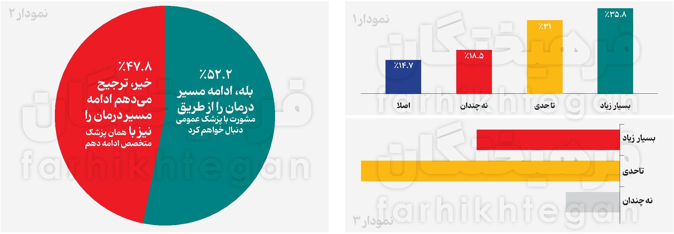 - بدون استثنا همه پاسخدهندگان، بر حدی از تفاوت میان نظرات تشخیصی و درمانی پزشکان مختلف اتفاقنظر دارند. از این میان در مجموع 88.2 درصد این تفاوت را «بسیار زیاد» و «تا حدی» توصیف کرده و حتی یک نفر نیز گزینه اصلاً را انتخاب نکرده است. این باور عمومی نشان میدهد در صورت مراجعه به یک پزشک، احتمال متقاعد نشدن و مردّد ماندن مردم قابل توجه است و باید برای آن تدبیری داشت که منجر به عدم تمایل به ادامه مسیر ارجاع یا خروج از آن نشود. اگرچه شاید اعمال رویه یکسان بین همه پزشکان و در تمامی موقعیتها شدنی نباشد و نتوان چنین انتظاری داشت، اما حداقل میتوان به راهکارهایی اندیشید که این حد از انگاره تفاوت را ایجاد نکند. پایبندی پزشکان به راهنماهای بالینی و عدم تخریب چهره پزشکان توسط یکدیگر حتی در صورت تشخیص متفاوت، در بازسازی این باور عمومی ضروری بهنظر میرسد.