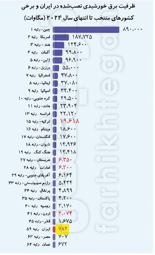 در میان همسایگان ایران، ترکیه تا سال 2024 با نصب 19 هزار و 618 مگاوات در رتبه 15 جهان جای گرفته اما در ماههای اخیر این مقدار به حدود 22 هزار مگاوات رسیده که جایگاه این کشور را یک رتبه ارتقا داده و به 14 میرساند. عربستان و امارات با 6.3 هزار مگاوات در رتبههای 27 و 28 جهان جای دارند، پاکستان با 4.2 هزار مگاوات در رتبه 35 قرار داشته و احتمالا امسال به جایگاه 15 تا 16 میرسد. روسیه با 2.2 هزار مگاوات در رتبه 41 قرار داشته، اردن با 2 هزار مگاوات در رتبه 41، قطر با 1.7 هزار مگاوات در رتبه 45 و ایران با 782 مگاوات در رتبه 59 جهان تا پایان سال 2024 بوده است.