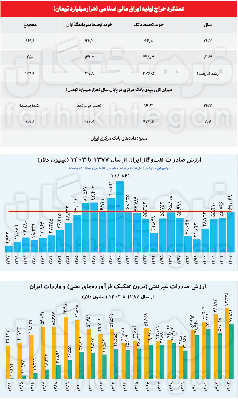 براساس گزارش بانک مرکزی ایران، در سال 1403 صادرات غیرنفتی کشور (بدونتفکیک فراوردههای نفتی) حدود 57.8 میلیارد دلار بوده که در مقایسه با سال 1402 حدود 16 درصد رشد داشته است. همچنین حجم واردات به 72 میلیارد و 375 میلیون دلار رسیده که در مقایسه با سال قبل از خود رشد 8.2 درصدی را تجربه کرده است. همچنین در سال گذشته از رقم 72.4 میلیارد دلار واردات کشور، حدود هشتمیلیارد دلار از آن مربوط به طلا بوده که به افزایش و تقویت ذخایر و داراییهای کشور منجر شده است.
