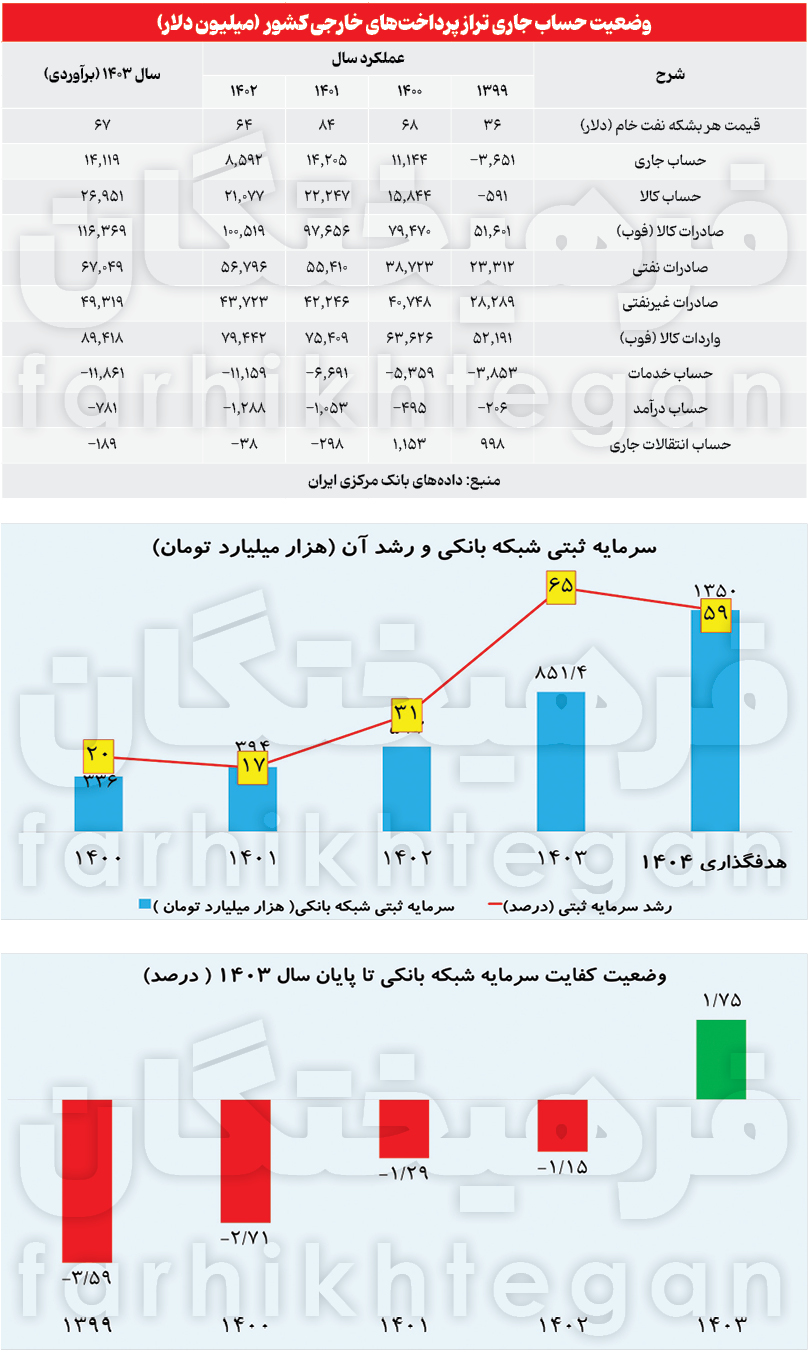 فرزین در ادامه به دادههای افزایش سرمایه ثبتی نظام بانکی اشاره میکند و میگوید: «میزان افزایش سرمایه ثبتی شبکه بانکی در سال 1403 معادل 65 درصد بوده و از 517 همت در پایان سال 1402 به 851.4 همت در پایان سال 1403 رسیده است.» به گفته وی، با احتساب مجوزهای صادره به بانکهای غیردولتی معادل 177 همت، عبور سرمایه ثبتی از 1000 همت در نیمه اول سال محتمل است. همچنین با توجه به تکلیف وزارت اقتصاد مبنی بر افزایش سرمایه 200 همتی در بانکهای دولتی طی سال 1404، انتظار میرود سرمایه شبکه بانکی بالغ بر 1350 همت در پایان سال 1404 شود.
