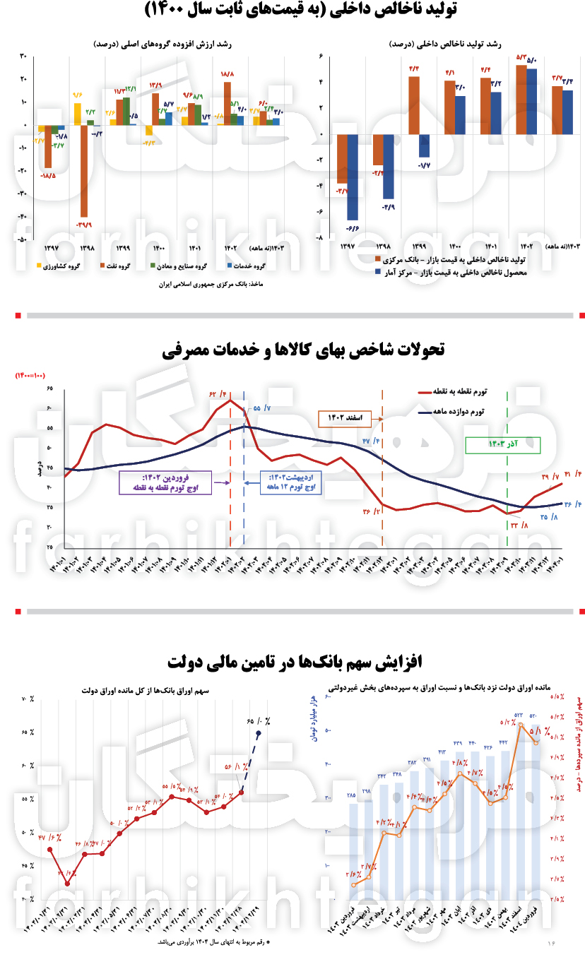 بخش دیگری از سخنرانی فرزین به ارائه آمار خرید اوراق دولتی از سوی بانکها برمیگشت. وی که از این موضوع به عنوان یکی از دلایل عدم تحقق نرخ رشد نقدینگی هدفگذاری شده نیز نام برده بود، از رشد 376 درصدی خرید اوراق دولتی در سال 1403 توسط بانکها خبر داد و گفت: «در سال 1402 بانکها 66.8 همت اوراق دولتی خریداری کرده بودند که این رقم در سال 1403 با رشد 376 درصدی به 318 همت افزایش یافت. همچنین حجم ریپو از 204 همت در سال 1402 به 422 همت در سال 1403 رسید که نشان از رشد 107 درصدی دارد.» فرزین در ادامه افزود: «مجموع این عوامل نشاندهنده سلطه مالی دولت بر سیاستهای پولی است که امکان کنترل رشد نقدینگی در محدوده هدفگذاری شده سال گذشته را از بانک مرکزی سلب کرد.»