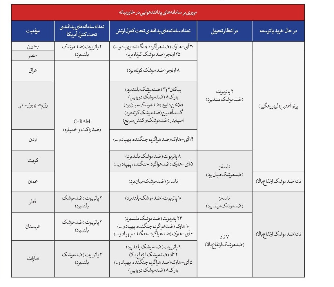 عربستان، از استقرار سامانههای اسرائیلی در خاک خود اجتناب کرده اما با بهرهگیری از مجموعهای متنوع و پیشرفته از سامانههای راداری و پدافندی نظیر پاتریوت و تاد که اغلب ساخت آمریکا هستند، ایفای نقش کرده است.