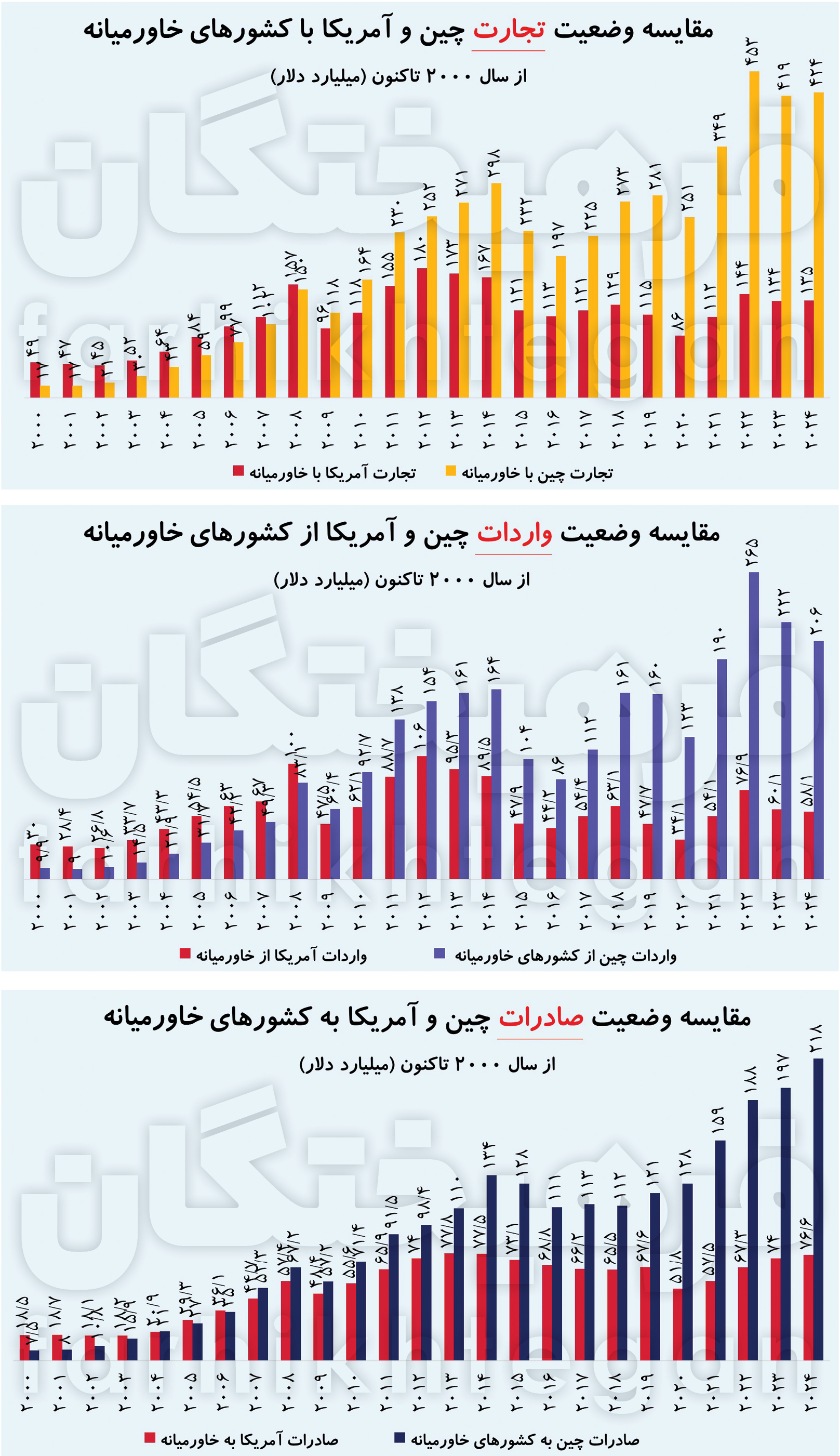 مقایسه حجم واردات دو کشور از خاورمیانه هم گویای این وضعیت است. درحالی که در سال 2000 حجم واردات آمریکا از خاورمیانه 30 میلیارد دلار بوده، این میزان برای چینیها تنها 10 میلیارد دلار بوده است. اما در سال 2024 واردات آمریکا از خاورمیانه 58 و این میزان برای چینیها 206 میلیارد دلار است. البته در سالهای گذشته واردات چینیها از خاورمیانه حتی به عدد 265 میلیارد دلار نیز نزدیک شد. این دادهها حکایت از آن دارد درحالی که واردات چینیها از خاورمیانه طی 24 سال اخیر 21 برابر شده، این میزان برای ایالات متحده تنها 2 برابر شده است.