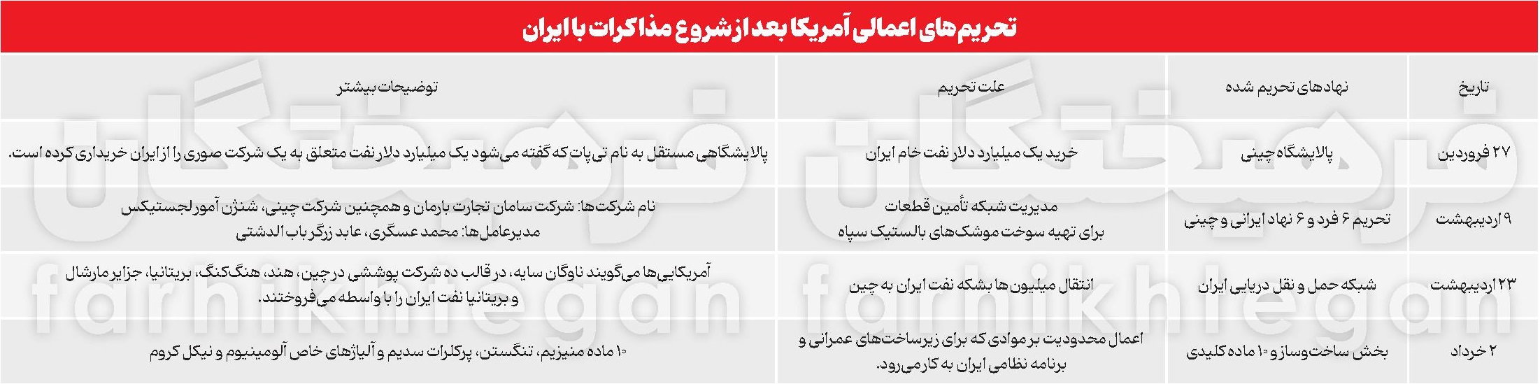 27 فروردین همزمان با شروع دور اول مذاکراتی ایران و آمریکا، وزارت خزانهداری آمریکا، تحریمهایی را علیه یک پالایشگاه مستقل چینی به بهانه خرید نفت از ایران اعمال کرد. آمریکا این پالایشگاه مستقل مستقر در چین به نام تیپات را بهخاطر نقش این پالایشگاه در خرید بیش از یکمیلیارد دلار نفت خام ایران، تحریم کرد. سه روز بعد از پایان دور سوم مذاکراتی ایران و آمریکا یعنی 9 اردیبهشتماه، وزارت خزانهداری آمریکا این بار تحریمهایی علیه 6 فرد و 6 نهاد در ایران و چین اعمال کرد. این تحریمها که گفته میشد به خاطر مدیریت آنچه، شبکه تأمین قطعات و مواد لازم برای تهیه سوخت موشکهای بالستیک سپاه، خوانده میشد، اعمال شده است، علیه شرکتی ایرانی به نام «سامان تجارت بارمان» و شرکت چینی «شنژن آمور لجستیکس»، اعمال شده است. آمریکاییها رسم اعمال تحریم و اعمال فشار علیه ایران را در دور چهارم مذاکراتی هم ادامه دادند و دو روز بعد از برگزاری چهارمین دور مذاکراتی ایران و آمریکا، شبکه حملونقل دریایی ایران را تحریم کردند در این لیست تحریمها، نام ناوگانی موسوم به سایه وجود دارد که آمریکاییها ادعا میکنند، از طریق چند شرکت پوششی، اپراتورهای بندری و واسطههایی در چین، هنگکنگ، درآمدهای میلیارددلاری برای ایرانیان همراه داشته است. آمریکاییها در آستانه پنجمین دور مذاکراتی هم تحریمهایی علیه بخش ساختوساز ایران اعمال کردند. اینها تقریباً تمام تحریمهایی است که واشنگتن، همزمان با شروع مذاکرات با ایران، آنها را علیه ایران فعال کردند. با این حساب، تقریباً بیش از 60 درصد تحریمهای اعمالی در دولت جدید آمریکا، تنها در زمان مذاکره با آمریکاییها اعمال شده است، محدودیتهایی که چند هدف مشخص را علیه ایران دنبال میکند؛ اعمال این تحریمها نشان میدهد آمریکاییها نهتنها از بهکارگیری سیاست فشار حداکثری علیه ایران عقب ننشستند، بلکه دایره این فشار را تنگتر کردند، اعمال این تحریمها چند روز بعد از برگزاری جلسات مذاکراتی، هم نوعی اهرم فشار برای مذاکرهکنندگان در جهت اجرای خواستههای آنها به شمار میرفت، هم در راستای تأیید این گزاره بود که اگرچه مذاکرات با ایران در جریان است اما تغییری در سیاستهای آمریکا در مورد ایران ایجاد نشده است.
