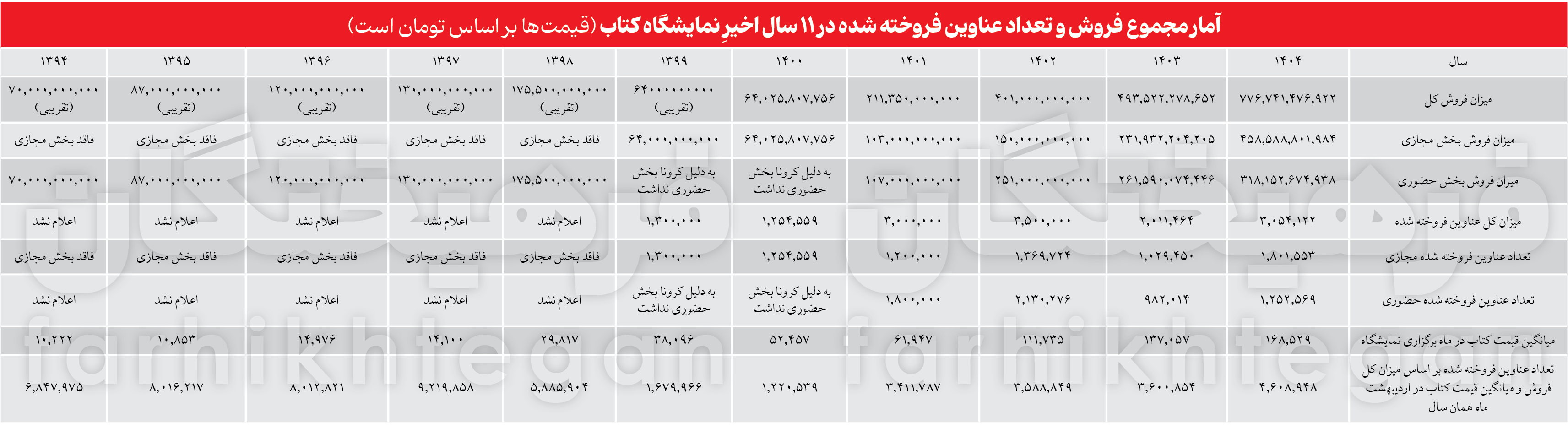در سال 98،175 میلیارد و 500 میلیون تومان، فروش کل ثبت میکند، از آنجایی که پیش از سال 99 آماردهی با جزئیات چندان مرسوم نیست، حالا این رقم را تقسیم بر آمار میانگین قیمت کتاب در اردیبهشت ماه 1398 کرده و آن را با آمارهای نمایشگاه کتاب امسال مقایسه کنید. آمارهای نمایشگاه کتاب در سال 1398 را مقایسه کنید با همین شکل از نمایشگاه در سال 1394. نمایشگاه کتاب در سال 1394، 70 میلیارد تومان فروش کل دارد و اگر با میانگین قیمت کتاب در اردیبهشت ماه همان سال مقایسه کنیم، به رقم 6,847,975 میرسیم و این رقم در قیاس با آمار سال 98 نشان میدهد 98 یکی از بدترین آمارهای چند سال اخیر را رقم زده است. با این حال باز هم آمارهای 1404 و تمام سالهای بعد از سال 1400، از نمایشگاه 98 به بعد بدتر است.