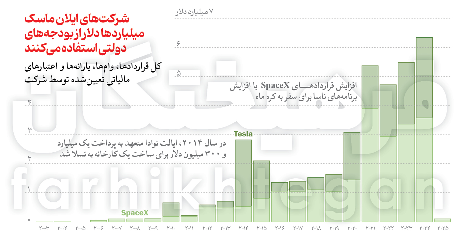 شواهد حکایت از آن دارد که وعده پرداخت حدود دو سوم از 38 میلیارد دلار بودجه دولتی طی پنج سال گذشته به تجارت ماسک داده شده است. تنها در سال 2024، دولتهای فدرال و محلی متعهد به پرداخت 6 میلیارد و 300 میلیون دلار به شرکتهای تحت مدیریت ایلان ماسک شدهاند. اما مبلغ کلی، بسیار بزرگتر از این ارقام است. این تحلیلها تنها قراردادهای عمومی در دسترس را شامل میشوند. SpaceX در حال توسعه ماهوارههای جاسوسی برای دفتر ملی شناسایی، بخش ماهوارههای جاسوسی پنتاگون بوده است. «وال استریت ژورنال» با استناد به اسناد شرکت اعلام کرد که این قرارداد یک میلیارد و 800 میلیون دلار ارزش داشته است. بر این اساس، 52 قرارداد جاری دیگر با 7 آژانس دولتی، از جمله ناسا، وزارت دفاع و اداره خدمات دولتی، در حال انجام است که احتمالاً طی چند سال آینده 11 میلیارد و 800 میلیون دلار دیگر به شرکتهای ماسک پرداخت خواهد شد. قراردادهای دولتی SpaceX از سوی ناسا و وزارت دفاع بیشترین حجم بودجهها را به خود اختصاص دادهاند. تسلا در اعتبارات نظامی حدود 11 میلیارد و 400 میلیون دلار از برنامههای فدرال و ایالتی با هدف تقویت صنعت خودروهای الکتریکی استفاده کرده است و کارشناسان بر این باورند که فروش این شرکت خودروسازی با اعتبار مالیاتی خودروهای الکتریکی 7500 دلاری برای مشتریان تقویت شده است به طوری که به مقرون به صرفهتر شدن خودروهای تسلا کمک کرده است که میتوانند تا 80 هزار دلار قیمت داشته باشند.