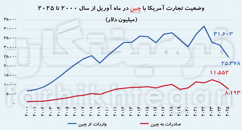 گرچه هنوز برای قضاوت درخصوص آثار و تبعات جنگ تعرفهای ترامپ زود است، اما دادههای رسمی نشان میدهد در همین ماه اول نیز جنگ تعرفهای ترامپ آثار حائز اهمیتی در مبادی و مقاصد اصلی تجارت این کشور بر جای گذاشته است. یکی از مهمترین آثار این جنگ تعرفهای، اثر چشمگیر این تصمیم بر تجارت آمریکا با چین بوده است. بر اساس دادههای اداره آمار آمریکا، حجم واردات این کشور از چین در آوریل امسال 25.4 میلیارد دلار بوده که نسبت به واردات 31.6 میلیارد دلار در آوریل سال گذشته کاهش 20 درصدی را تجربه کرده است. همچنین صادرات آمریکا به چین در ماه آوریل امسال نزدیک به 8.2 میلیارد دلار است که کاهش 29 درصدی نسبت به صادرات 11.5 میلیارد دلاری در ماه آوریل 2024 داشته است.