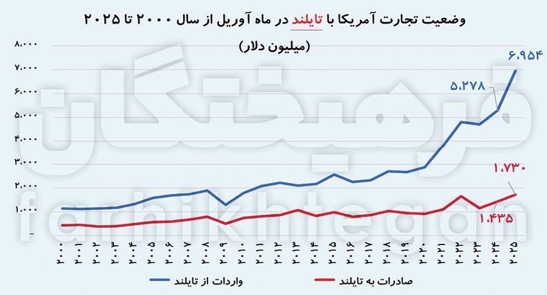 تایلند: در کنار تایوان، تایلند نیز از دیگر مقاصدی است که تجارت این کشور با آمریکا در آوریل امسال رشد قابل ملاحظهای دارد، بهطوری که در آوریل امسال واردات آمریکا از این کشور نزدیک به 7 میلیارد دلار و صادرات آمریکا به این کشور 1.7 میلیارد دلار بوده که نسبت به آوریل سال گذشته به ترتیب رشد 31.8 و 20.6 درصدی داشته است.