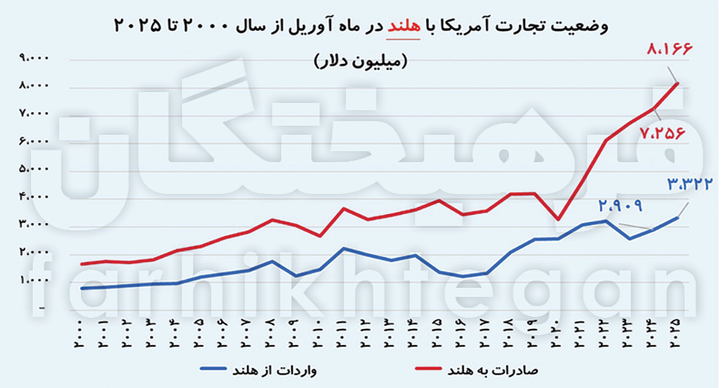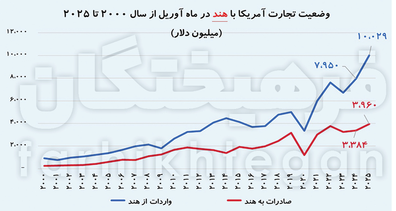 هند: هند نیز ازجمله کشورهایی است که ظاهراً دولت جدید آمریکا حساب ویژهای روی تجارت با این کشور باز کرده است. در آوریل امسال واردات آمریکا از هند بیش از 10 و صادرات به این کشور حدود 4 میلیارد دلار بوده که نسبت به مدت مشابه سال 2024 به ترتیب رشد 26.2 و 17 درصدی دارد.