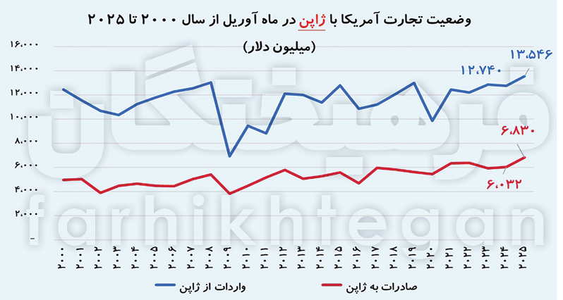 ژاپن: ژاپن نیز ازجمله کشورهایی است که تجارت آن در آوریل نسبت به آوریل سالهای گذشته روند افزایشی را تجربه کرده است. حجم واردات آمریکا از ژاپن در آوریل امسال 13.5 و صادرات به این کشور 6.8 میلیارد دلار بوده که نسبت به آوریل سال گذشته به ترتیب افزایش 6.3 و 13.2 درصدی داشته است.