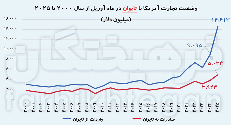 تایوان: تایوان ازجمله کشورهایی است که تجارت این کشور با آمریکا در آوریل امسال رشد چشمگیری داشته است. حجم واردات آمریکا از این کشور در ماه آوریل 14.6 میلیارد دلار و حجم صادرات آمریکا به این کشور بیش از 5 میلیارد دلار بوده که نسبت به آوریل سال گذشته به ترتیب نزدیک به 61 و 28 درصد رشد نشان میدهد.