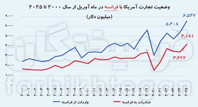 فرانسه: روندی که در مالزی و هلند تجربه شده، در فرانسه نیز تکرار شده است. در آوریل امسال واردات آمریکا از این کشور 6.5 و صادرات به فرانسه 4.2 میلیارد دلار بوده که نسبت به آوریل 2024 به ترتیب رشد 21 و 22 درصدی را نشان میدهد.