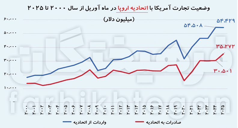 برخلاف چین، تجارت آمریکا با اتحادیه اروپا روند معکوسی را تجربه کرده است. صادرات آمریکا به اتحادیه اروپا در آوریل امسال به 35.3 میلیارد دلار رسیده که نسبت به آوریل سال گذشته رشد 15.6 درصدی دارد. اما واردات آمریکا از اتحادیه در آوریل سال جاری 54.4 میلیارد دلار است که نسبت به آوریل سال گذشته تقریبا بدون تغییر مانده و کاهش آن خیلی جزئی و زیر نیم درصد است. البته در ادامه اشاره خواهد شد که روند تجارت آمریکا با کشورهای عضو اتحادیه بسیار نوسانی بوده، به طوری که تجارت این کشور با برخی اعضا افزایش و با برخی روند کاهشی را تجربه کرده است.