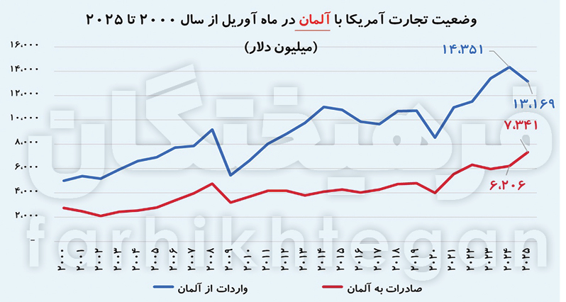 آلمان: روند مشابهی در آلمان شبیه به تجارت آمریکا با انگلستان تجربه شده است. حجم واردات آمریکا از آلمان در ماه آوریل امسال 13.2 و صادرات به این کشور 7.3 میلیارد دلار بوده که نسبت به مدت مشابه سال گذشته به ترتیب 8.2 درصد کاهش و 18.3 درصد افزایش داشته است.