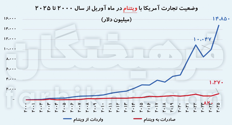 ویتنام: در کنار سوئیس، ویتنام نیز از دیگر شرکای تجاری آمریکاست که در آوریل امسال تجارت این کشور با آمریکا رشد چشمگیری داشته است. در آوریل امسال واردات آمریکا از این کشور 14.8 و صادرات به ویتنام 1.3 میلیارد دلار بوده که به ترتیب 48 و 55 درصد رشد داشته است.