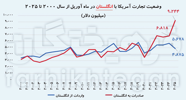 انگلستان: در ماه آوریل، انگلستان در بین کشورهای اروپایی به یک مقصد جدید برای کالاهای آمریکایی تبدیل شده است. در ماه آوریل امسال حجم واردات آمریکا از انگلستان نزدیک به 4.9 میلیارد دلار و حجم صادرات به انگلستان 9.2 میلیارد دلار بوده که به ترتیب نسبت به آوریل سال گذشته 14 درصد کاهش و 35.6 درصد افزایش یافته است.