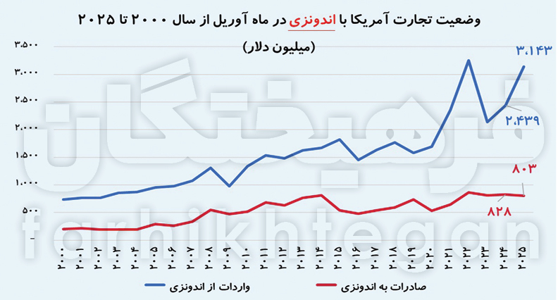 اندونزی: در اندونزی برخلاف سایر کشورها، واردات آمریکا از این کشور افزایش محسوسی نسبت به سال گذشته داشته است. در آوریل امسال واردات آمریکا از این کشور 3.1 و صادرات به اندونزی 803 میلیون دلار بوده که به ترتیب رشد 29 درصدی و کاهش 3 درصدی داشته است.