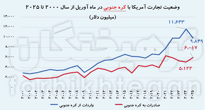 کرهجنوبی: وضعیتی که در خصوص آلمان و برخی کشورهای دیگر از آن بحث شد، در کرهجنوبی نیز اتفاق افتاده است. در آوریل امسال واردات آمریکا از کره 9.8 و صادرات به این کشور بیش از 6 میلیارد دلار بوده که نسبت به مدت مشابه سال گذشته به ترتیب کاهش 15.4 درصدی و افزایش 17.5 درصدی داشته است.