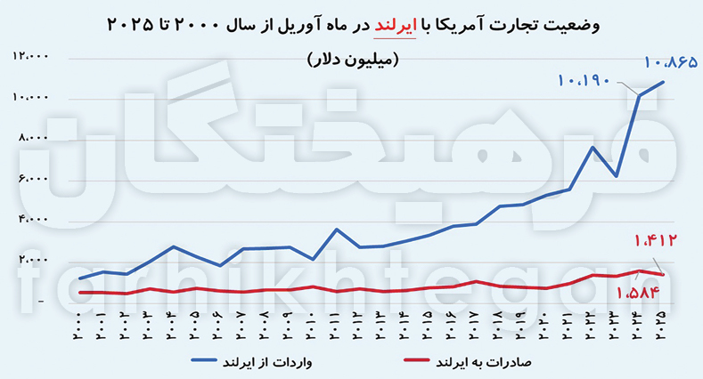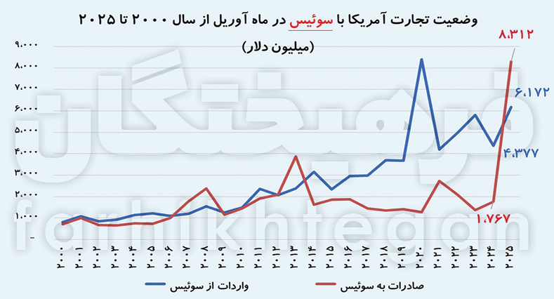سوئیس: در رتبه اول رشدهای چشمگیر تجارت با آمریکا، کشور سوئیس قرار دارد. درآوریل امسال واردات آمریکا از این کشور 6.2 و صادرات به این کشور 8.3 میلیارد دلار بوده که نسبت به مدت مشابه سال 2024 به ترتیب 41 و 370 درصد رشد نشان میدهد. بررسی روند تاریخی تجارت آمریکا با سوئیس نشان میدهد صادرات آمریکا به این کشور در ماه آوریل امسال از سال 2000 تاکنون بیسابقه بوده است، بهطوری که بالاترین رقم قبل از آوریل سالجاری 2.7 میلیارد دلار در آوریل 2021 بوده است.
