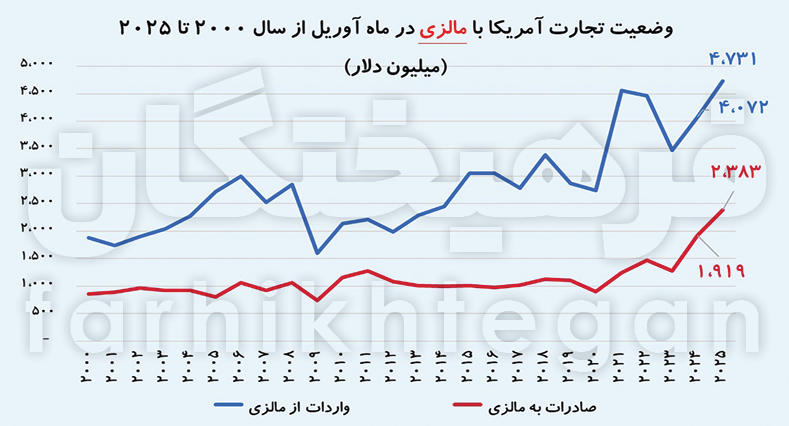مالزی: وضعیت مالزی نیز بسیار شبیه به هلند است. در آوریل امسال واردات آمریکا از این کشور 4.7 و صادرات به مالزی 2.4 میلیارد دلار بوده که نسبت به ماه مشابه سال گذشته افزایش 16.2 و 24.2 درصدی داشته است.
