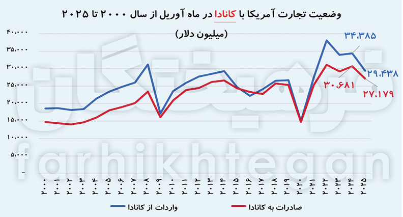 در کنار مکزیک، وضعیت کانادا بسیار جالب توجه است. در آوریل امسال واردات آمریکا از کانادا 29.4 میلیارد دلار و صادرات این کشور به کانادا 27.2 میلیارد دلار بوده که نسبت به آوریل سال گذشته کاهش 14.4 درصدی و 11.4 درصدی داشته است.