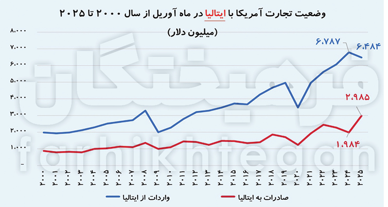 ایتالیا: ایتالیا دیگر مقصدی است که صادرات آمریکا به این کشور در آوریل امسال افزایش قابل توجهی داشته است، بهطوری که حجم صادرات آمریکا به این کشور در آوریل امسال نزدیک به 3 میلیارد دلار بوده که نسبت به مدت مشابه سال گذشته جهش 50 درصدی داشته است. همچنین واردات آمریکا از ایتالیا در آوریل امسال نزدیک به 6.5 میلیارد دلار بوده که نسبت به آوریل سال گذشته کاهش 4.5 درصدی دارد. درمجموع، صادرات آوریل امسال آمریکا به ایتالیا بالاترین مقدار صادرات این کشور به ایتالیا از سال 2000 تاکنون بوده است.