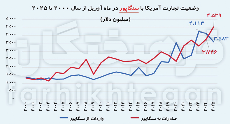 سنگاپور: اتفاقی که برای انگلیس و برخی از کشورها رخ داده، در تجارت آمریکا با سنگاپور نیز تکرار شده است. در ماه آوریل امسال واردات آمریکا از سنگاپور 3.6 و صادرات به سنگاپور 4.5 میلیارد دلار بوده که نسبت به آوریل سال گذشته به ترتیب 13 درصد کاهش و 21 درصد افزایش داشته است.