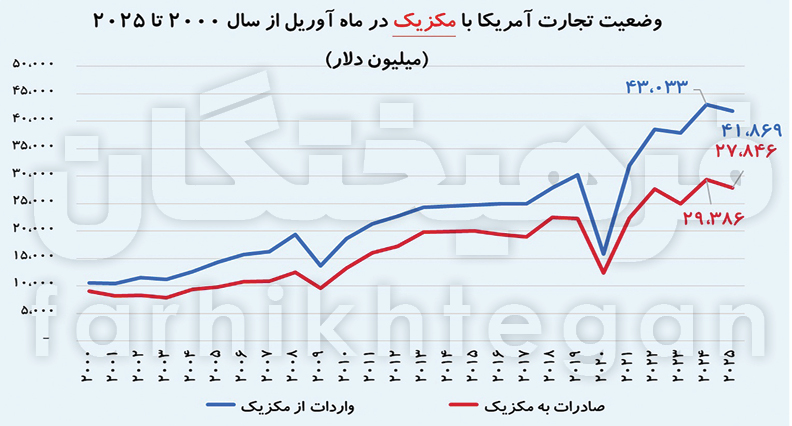 یکی از کشورهایی که خیلی زود با خشم و غضب دونالد ترامپ روبهرو شد، مکزیک بود. این کشور به همراه کانادا از اولین کشورهایی بودند که در کنار چین، مورد حمله تعرفههای تجاری دولت جدید آمریکا قرار گرفتند. بررسی دادههای رسمی آمریکا نشان میدهد در آوریل امسال واردات آمریکا از مکزیک نزدیک به 41.9 میلیارد دلار است که کاهش 2.7 درصدی نسبت به آوریل سال گذشته دارد. همچنین صادرات آمریکا به مکزیک در آوریل امسال 27.8 میلیارد دلار است که کاهش 5.2 درصدی را تجربه کرده است.