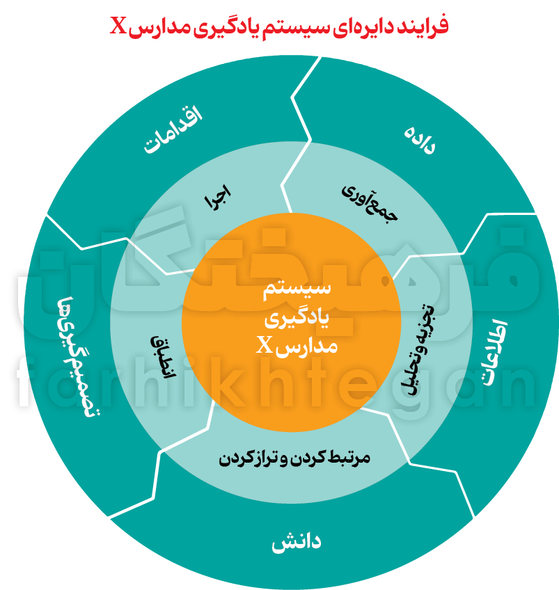 تحولات داخلی مدرسه، اکتشافات علمی جدید، تحولات اجتماعی و پیشرفتهای فناوری، جزء مواردیاند که میتوانند بر تدریس تأثیر بگذارند. مدرسه X یک مدرسه یادگیری مادامالعمر تعریف میشود. برای اطمینان از اینکه این مدرسه هرگز از تکامل باز نمیماند در هر مدرسه، یک مدیر تحقیقوتوسعه در خارج از بدنه آزمایشگاه X مدرسه متشکل از مربیان، محققان، کارآفرینان و هنرمندان از سراسر جهان شکل گرفتهاند. با همکاری بین دوبدنه مدرسه X و آزمایشگاه X، فرایندی دایرهای از توسعه مداوم حاصل میشود که از چند حوزه داده، اطلاعات، دانش، تصمیمگیریها و عمل تشکیل میشود و این دو بدنه در قالب سیستم یادگیری مدارس X به جمعآوری داده، تجزیهوتحلیل اطلاعات، مرتبط کردن و ترازکردن دانش، انطباق تصمیمگیریها و اجرای اقدامات میپردازند.