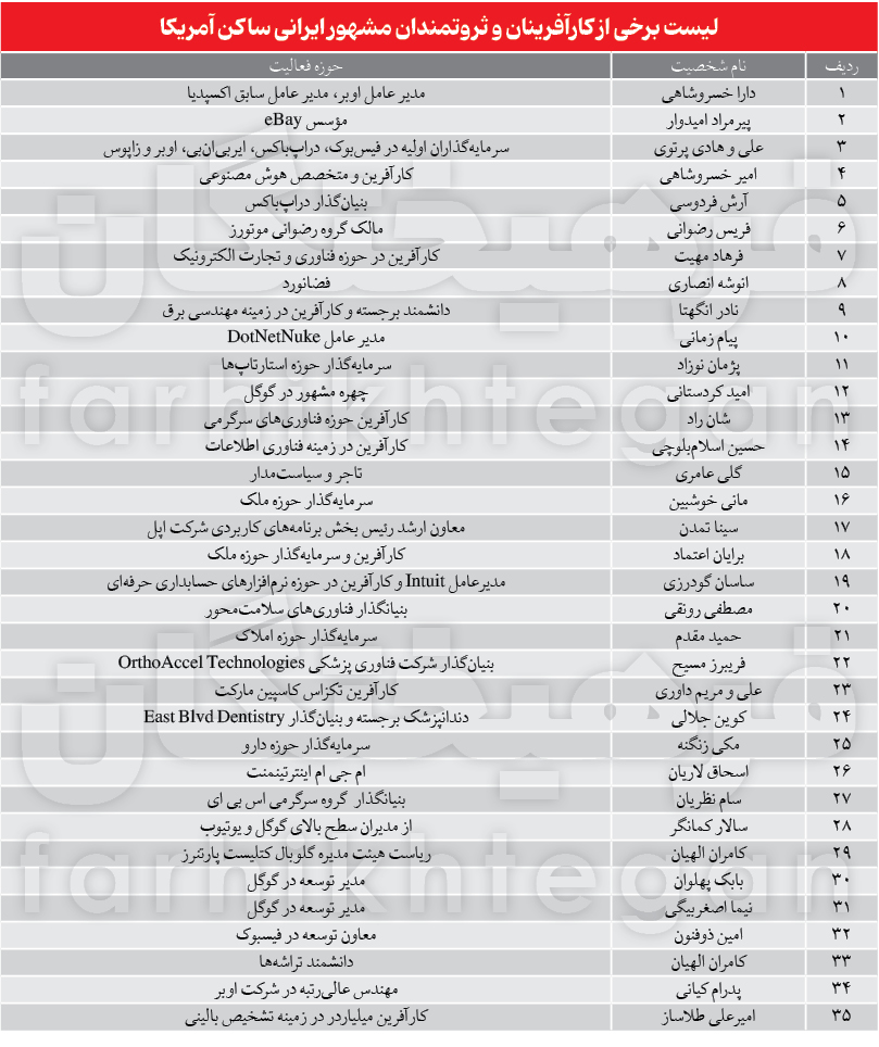 فاطمه سادات مرتضوی، خبرنگار گروه اقتصاد: روز گذشته فیلمی از جلسه دونالد ترامپ با فعالان اقتصادی آمریکایی در کاخ سفید منتشر شد که رئیسجمهور آمریکا خطاب به دارا خسروشاهی، مدیرعامل ایرانیتبار شرکت «اوبر» میگوید «فکر میکنم تو باید این مذاکرات را پیش ببری. شاید [تو برای این کار] بهتر باشی. فکر کنم امروز تو را برای مذاکره بفرستم. عجب ایدهای، میتواند ایده روز باشد. اصلاً دارا را برای مذاکره با ایران بفرستیم.» فارغ از اینکه کشورمان چقدر توانسته از ایرانیان ساکن خارج برای لابی با نهادهای اقتصادی، سیاسی و اجتماعی این کشورها استفاده کند، «فرهیختگان» در گزارش پیش رو به بررسی جزئیاتی از زندگی، دارایی و فعالیتهای اقتصادی برخی از کارآفرینان ایرانی ساکن آمریکا پرداخته است. لازم به ذکر است این لیست فارغ از گرایشها و تفکرات سیاسی این افراد تهیه شده و قرارگرفتن افراد در این لیست، به معنی تأیید یا رد گرایشهای فکری و سیاسی آنان نیست.