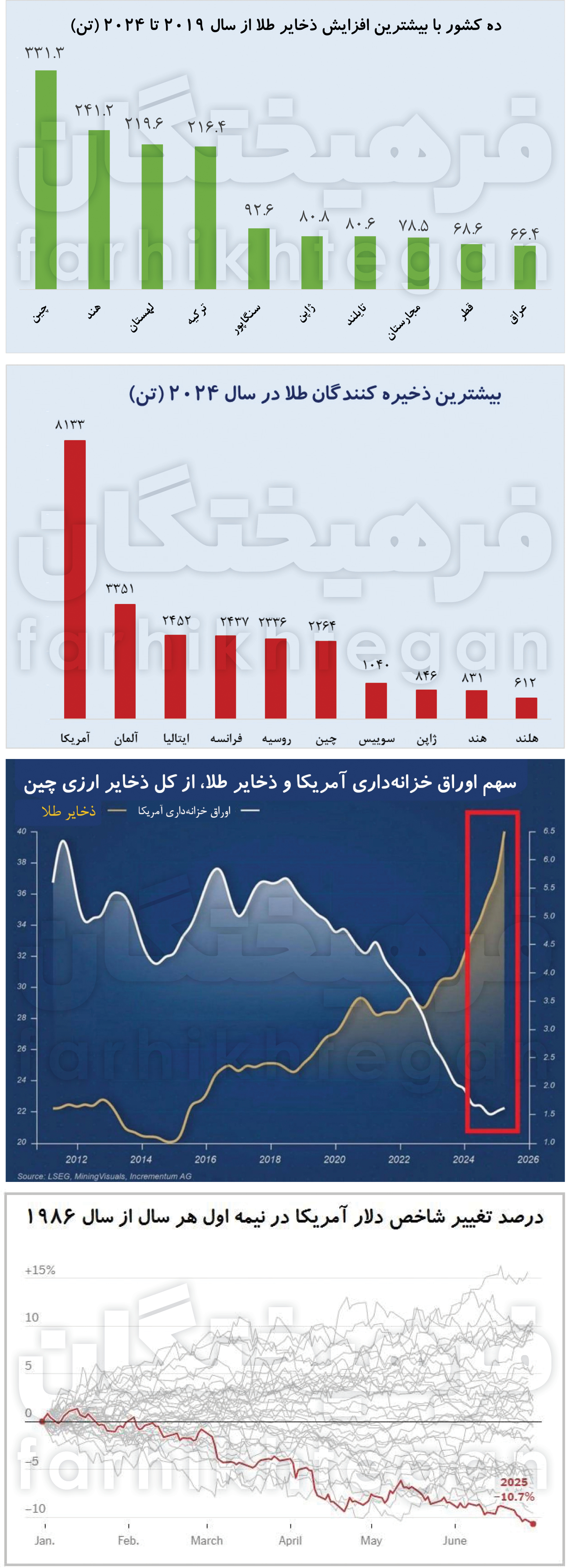 بررسیها نشان میدهد رویآوردن جهان به طلا باعث شده قیمت طلا نسبت به 16 سال گذشته 233 درصد افزایش یابد و به رکورد فعلی بیش از 3336 دلار در هر اونس برسد. در همین راستا، خرید طلا در سالهای اخیر به عنوان بخشی از تقاضای رو به رشد بانکهای مرکزی و سرمایهگذاران، شتاب بیشتری گرفته است. در سالهای ۲۰۲۲ و ۲۰۲۳، بانکهای مرکزی بیش از هزار تن طلا در سال خریداری کردند که بیش از دوبرابر حجم سالانه 10 سال گذشته است. این خریدها توسط بانکهای مرکزی چین و روسیه و پس از آن چندین کشور با بازار نوظهور از جمله ترکیه، هند، قزاقستان، ازبکستان و تایلند انجام شده است. به طور خاص، بانک چین سهم طلا در ذخایر خود را از ۱.۸ درصد در سال ۲۰۱۵ به رکورد ۴.۹ درصد در سال 2024 افزایش داده است. در عین حال، سهم اوراق قرضه ایالات متحده را از ۱.۳ تریلیون دلار در اوایل دهه ۲۰۱۰ به ۷۸۰ میلیارد دلار در ژوئن ۲۰۲۴ کاهش داده است. در همین راستا باید افزود داراییهای طلا، با ارزشگذاری بر اساس قیمتهای بازار، ۱۵ درصد از ذخایر جهانی را تشکیل میدهند. در نتیجه، سهم دلار آمریکا در کل ذخایر جهانی، شامل طلا، بهجای ۵۴.۸ درصد از ذخایر ارزی جهانی، به ۴۸.۲ درصد کاهش خواهد یافت. کاهش سهم دلار آمریکا در ذخایر ارزی جهانی نشان میدهد که این ارز، اگرچه هنوز گزینه اصلی بانکهای مرکزی است، اما بهتدریج در حال ازدستدادن سهم در بازار خود میباشد. طبق گزارش شورای آتلانتیک، دلار در ترتیبات ذخایر جهانی بهاندازهای که در صورتحسابهای تجاری و تأمین مالی بینالمللی غالب است، تسلط ندارد.