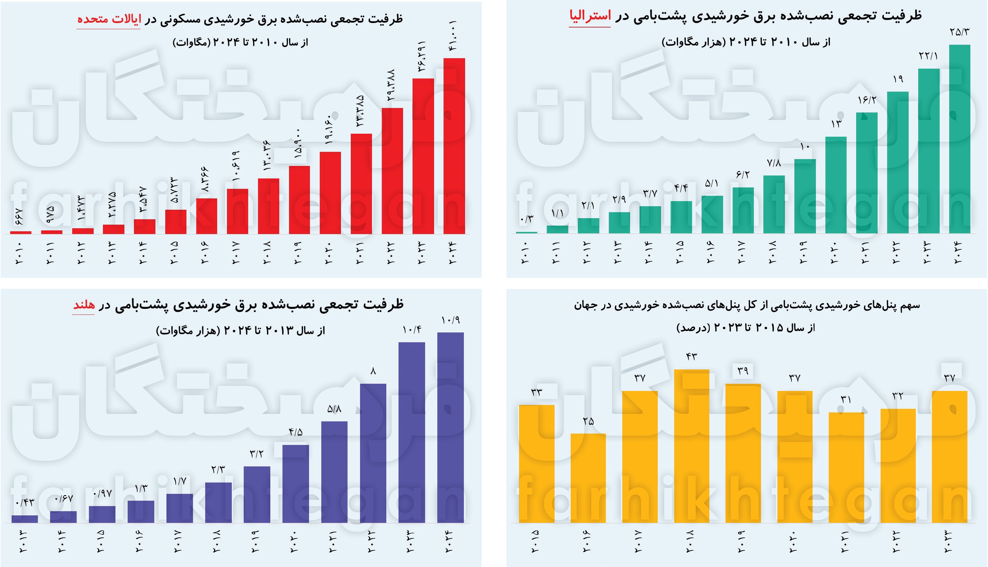 انرژی خورشیدی پشتبام بیش از 12.4 درصد از برق استرالیا را تولید میکند. خانوارها و اصناف نقش اصلی را در گذار به انرژیهای تجدیدپذیر در استرالیا ایفا میکنند. براساس گزارش جدید انرژی خورشیدی و ذخیرهسازی پشتبامی شورای انرژی پاک نشان میدهد میزان نصب برق خورشیدی پشتبامی در این کشور از سالانه 300 مگاوات ساعت در سال 2010 به سالانه 3 هزار مگاوات ساعت در سالهای 2020 تا 2024 رسیده است. همچنین طبق این آمارها، مجموع ظرفیت نصبشده سیستمهای فتوولتائیک خورشیدی (PV) روی پشتبامهای این کشور تا پایان سال 2024 به 25.3 هزار مگاوات رسیده است. در این گزارش آمده انرژی خورشیدی پشتبامی در سال ۲۰۲۴ بیش از ۱۲.۴ درصد از کل تولید انرژی استرالیا را تشکیل میدهد. طبق این آمارها، در مجموع انرژی خورشیدی پشتبامی اکنون دومین منبع بزرگ تولید برق تجدیدپذیر در استرالیا (پس از تولید انرژی بادی) و چهارمین منبع بزرگ تولید برق است. کان هریستودولیدیس، مدیر سیاستگذاری شورای انرژی پاک میگوید انرژی خورشیدی پشتبامی در ترکیب انرژی پاک استرالیا رشد سریعی را تجربه میکند و تخمین زده میشود از هر سه خانوار و کسبوکار، یک نفر این فناوری را نصب میکند. به گفته وی تا سال 2024 بیش از سهمیلیون استرالیایی سیستمهای خورشیدی پشتبامی در خانههایشان نصب کردهاند. وی گفت مقیاس و سرعت استفاده از انرژی خورشیدی پشتبامی در استرالیا به دلیل فراوانی نور خورشید و مزایای ذاتی آن ازجمله هزینههای انرژی و تعرفههای حمایتی پایینتر، در جهان بینظیر است.