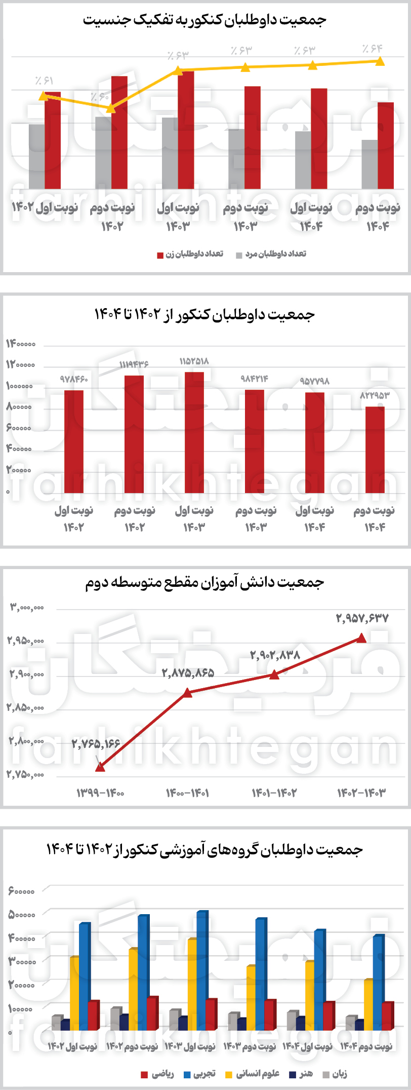 نگاهی به جمعیت داوطلبان نوبت دوم آزمون امسال نشان میدهد در مجموع 822 هزار و 953 داوطلب در پنج گروه آزمایشی این دوره شرکت کردهاند؛ جمعیتی که در مقایسه با پنج دوره گذشته، در کمترین حد خود قرار دهد. بهطوریکه دایره داوطلبان این دوره از کنکور نهتنها نسبت به نوبت اول کنکور امسال با کاهش 14 درصدی روبهرو بوده، بلکه اگر بخواهیم آنها را با جمعیت داوطلبانی که در نوبت دوم کنکور سال گذشته شرکت کردند مقایسه کنیم، باید عنوان کرد وضعیت بهمراتب بدتر هم شده، بهطوریکه از جمعیت 984 هزار و 214 نفری نوبت دوم سال گذشته به جمعیت بیش از 822 هزارنفری امسال رسیدهایم که حاکی از کاهش 17 درصدی دارد. وضعیت جمعیتی داوطلبان آخرین نوبت کنکور امسال در مقایسه با جمعیت یکمیلیون و 119 هزار و 436 نفری که در نوبت دوم کنکور سال 1402 شرکت کردند هم حاکی از این مسئله است که ظرف دوسال، ظرفیت داوطلبان با کاهش 26 درصدی همراه بوده است.