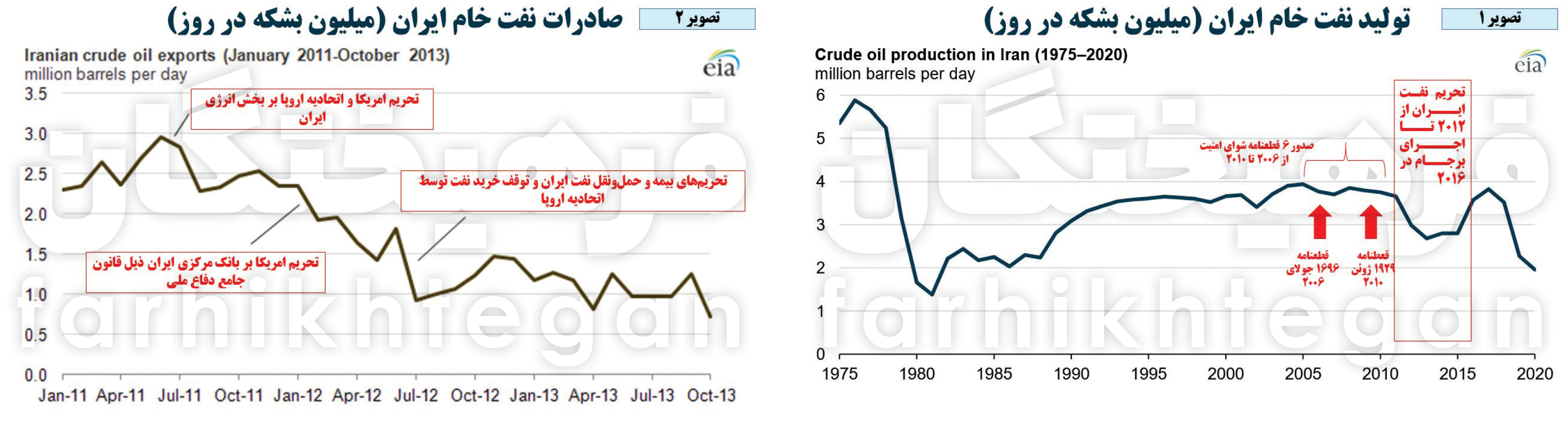 درآمد نفتی کشور خود تحتتأثیر دو عامل است: 1- میزان صادرات نفت خام و 2- وصول درآمدهای ارزی حاصله. درباره اثر بازگشت قطعنامههای شورای امنیت بر میزان صادرات نفت ایران، میتوان به تجربه گذشته در سالهای 2006 تا 2010 مراجعه کرد که در این سالها 6 قطعنامه علیه ایران صادر شده بود. تصویر 1، میزان تولید نفت خام ایران را طبق گزارش موسسه eia نشان میدهد. با توجه به ثابت بودن ظرفیت پالایشی نفت ایران، تغییرات میزان تولید در واقع همان تغییرات میزان صادرات نفت خام را نمایندگی میکند. همانطور که در تصویر 1 مشخص است، میزان تولید نفت ایران در بازه زمانی جولای 2006 تا ژوئن 2010 تغییری نکرده و در مرز 3.8 میلیون بشکه در روز (معادل حداکثر توان تولید نفت) باقی مانده اما به محض اعمال تحریمهای آمریکا علیه صنعت نفت و بانک مرکزی ایران در سال 2012، میزان تولید نفت کشور وارد روند نزولی خود میشود. درواقع آنچه باعث افت تولید و صادرات نفت ایران شده نه قطعنامه شورای امنیت، بلکه تحریمهای یکجانبه آمریکا بوده؛ موضوعی که توسط اداره اطلاعات انرژی آمریکا نیز در گزارشی با عنوان Sanctions reduced Iran's oil exports and revenues in 2012 اذعان شده است. طبق این گزارش، در سال 2012، صادرات نفت خام و میعانات گازی ایران به پایینترین سطح خود از سال 1986 رسید. درآمد خالص صادرات نفت ایران در سال 2012، 69 میلیارد دلار برآورد میشود که به طور قابل توجهی کمتر از درآمد 95 میلیارد دلاری ایران در سال ۲۰۱۱ بود. اداره اطلاعات انرژی آمریکا در گزارش 26 آوریل سال 2013 نوشت: «پس از اجرای تحریمها در اواخر سال 2011 و اواسط 2012، تولید نفت ایران به طرز چشمگیری کاهش یافت. اگرچه ایران پیشازاین تحت چهار دور تحریمهای سازمان ملل قرار گرفته بود، اما این اقدامات بسیار سختگیرانهتر که توسط ایالات متحده و اتحادیه اروپا تصویب شده بود، بهشدت مانع از صادرات نفت ایران شده که مستقیماً بر تولید نفت و فرآوردههای نفتی آن تأثیر گذاشته است.» بنابر این گزارش، صادرات نفت خام و میعانات گازی ایران در سال 2012 به حدود 1.5 میلیون بشکه در روز کاهش یافت، درحالیکه این رقم در سال 2011، 2.5 میلیون بشکه در روز بود. این کاهش 39 درصدی در صادرات نفت، با کاهش 17 درصدی تولید نفت خام و میعانات گازی ایران همراه بود. نکته جالب اینکه بعد از اعمال تحریمهای آمریکا، در آگوست 2012، تولید ماهانه نفت خام ایران برای اولینبار از سال 1989 به کمتر از تولید نفت عراق رسید و اکنون نیز ایران بعد از عربستان و عراق در جایگاه سومین تولیدکننده بزرگ نفت اوپک قرار دارد.
