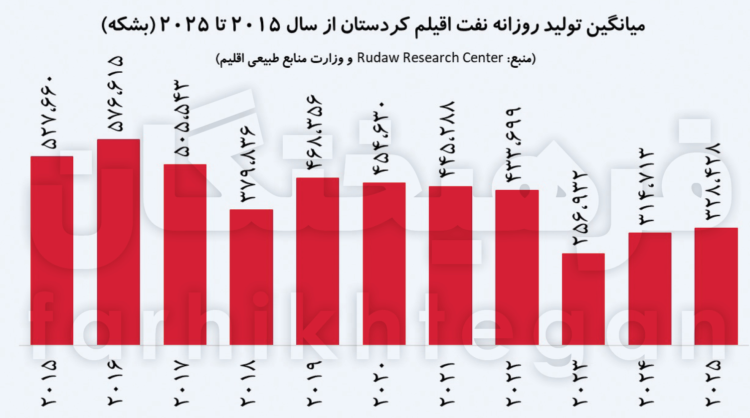 براساس گزارش مرکز تحقیقات روداو (Rudaw Research Center)، طی سهماهه دوم سال 2023 سطح تولید نفت در اقلیم کردستان به پایینترین مقدار در شش سال قبل از خود رسید. دادههای این نهاد تحقیقاتی نشان میدهد که از نظر تولید سالانه نفت، اوج تولید نفت اقلیم مربوط به سالهای 2015 تا 2017 با تولید روزانه 500 تا 577 هزار بشکه بوده و پس از آن، اوج تولید در سال 2019 با 468 هزار بشکه اختصاص دارد، در حالی که پایینترین سطح تولید در سال 2023 با تولید 257 هزار بشکه بوده است. در سال 2024 این عدد حدود 315 هزار بشکه ذکر شده و در سال 2025 نیز این مقدار تا قبل از حمله پهپادی اخیر حدود 328 هزار بشکه با میعانات گازی ذکر شده است.