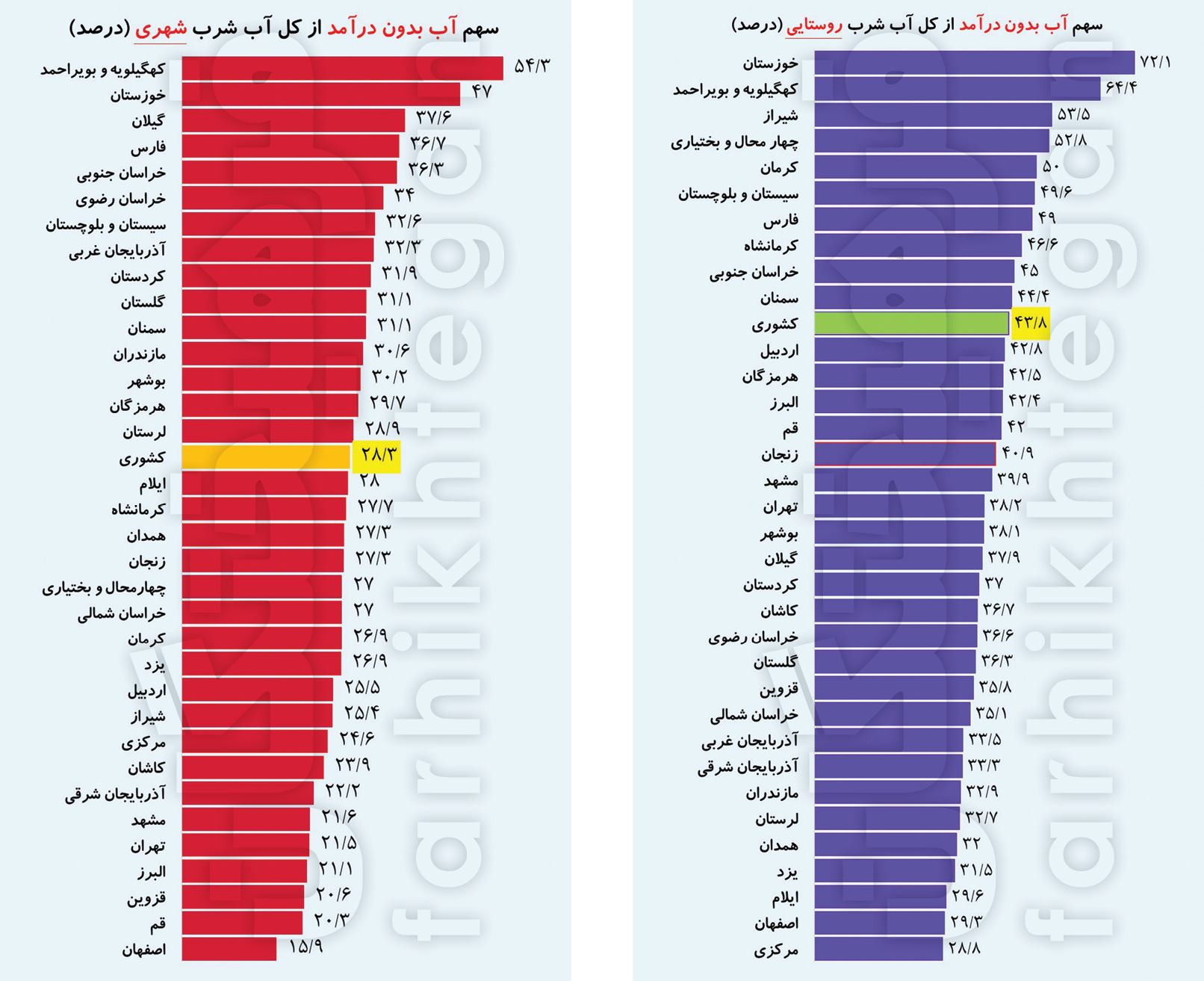 بررسیها از دادههای وزارت نیرو حاکی از آن است که در سال 1402، سهم آب بدون درآمد در کشور به طور میانگین بیش از 28 درصد بوده است. یعنی ۲۸ درصد از آب شرب تولیدی دولت بدون درآمد است. در دو استان کشور یعنی خوزستان و کهگیلویه و بویر احمد 50 درصد از آب گم میشود. این دو استان به همراه استان گیلان بیشترین سهم آب بدون درآمد در کشور را در سال 1402 داشتهاند. بیشتر از 37 درصد آب شرب تولیدی دولت در گیلان، بدون درآمد بود. درمقابل در استان اصفهان تنها 16 درصد از آب شرب تولیدی دولت بدون درآمد بوده است که کمترین میزان در کشور در سال 1402 است.