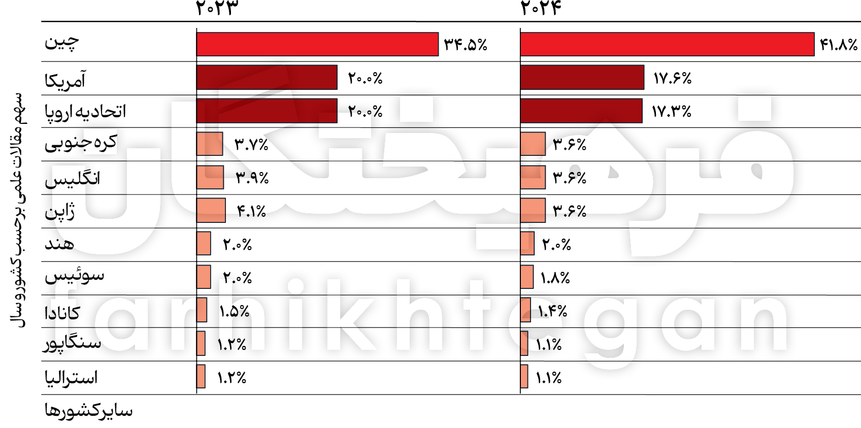 چین با افزایش 7 درصدی سهم خود از مقالات جهانی از سال 2023 تا 2024 در مجلات علوم فیزیکی، از نظر تعداد 42 درصدی مقالات علمی پیشتاز است. سهم چین از این مقالات در سال 2023 حدود 34.5 درصد بوده است. در این میان، آمریکا و اتحادیه اروپا از نظر تعداد مقالات در سالهای 2024- 2023 نزدیک به هم حرکت میکنند. سهم آمریکا از 20 درصد در سال 2023 به سهم 17.6 درصدی در سال گذشته کاهش یافته و اتحادیه اروپا نیز از سهم 20 درصدی به 17.3 درصدی رسیده است. سهم مقالات در کشورهایی که بین 11 کشور برتر نیستند، از 5.8 درصد در سال 2023 به سهم 5.1 درصدی در سال 2024 کاهش یافته است.