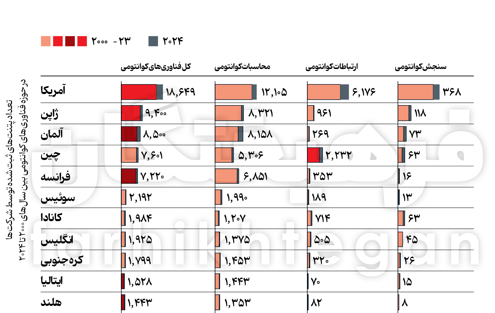 طبق آمار، فعالیت روی اختراعات ثبت شده در حوزه فناوری کوانتومی به طور سالانه در سال 2024 تا 13 درصد رشد نشان میدهد. طبق آمار، آمریکا با 27 درصد و ژاپن با 14 درصد از نظر سهم اختراعات ثبت شده جهانی در حوزه فناوریهای کوانتومی در صدر جدول جا خوش کردهاند. 11 کشور برتر دنیا حدود 90 درصد از اختراعات ثبت شده دنیا را به خود اختصاص دادهاند و در این میان، آلمان، فرانسه، ایتالیا و هلند به اتفاق، سهم 27 درصدی دارند. چین با 2232 اختراع ثبت شده، بالاترین تعداد اختراع را در ارتباطات کوانتومی از آن خود کرده است که حکایت از پیشرفت در این حوزه است. آمریکا با 12105 اختراع ثبت شده در محاسبات کوانتومی، 6176 اختراع در ارتباطات کوانتومی و 368 اختراع در سنجش کوانتومی با مجموع 18649 اختراع ثبتشده در مقام اول دنیا در تعداد اختراعات ثبت شده در فناوریهای کوانتومی قرار گرفته است. بعد از آن به ترتیب ژاپن با 9400 اختراع، آلمان با 8500، چین با 7601 و فرانسه با 7220 اختراع ثبت شده در ردههای دوم تا پنجم قرار گرفتهاند.