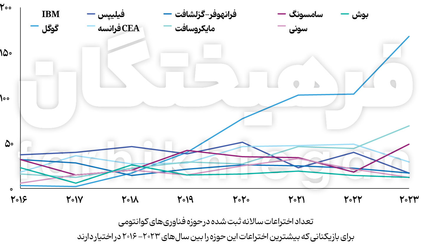 فعالترین پتنتها برای بزرگترین بازیگران فناوریهای کوانتومی در سالهای اخیر بیانگر افزایش تلاش در حوزه مالکیت معنوی است. آمارها نشان میدهد دکه IBM و گوگل در سال 2023 با افزایش قابل توجهی در تعداد اختراعات ثبت شده مواجه شدند. برخلاف این روند، CEA فرانسه و فیلیپس، از سال 2022 تاکنون با بیشترین کاهش تعداد اختراعات ثبت شده روبهرو شدهاند.