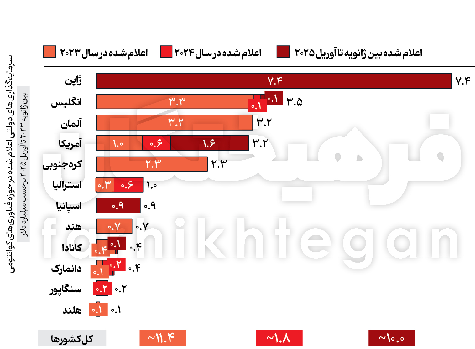 سرمایهگذاریهای ملی اعلام شده تا امروز درمجموع حدود 54 میلیارد دلار است. در این میان، چین با سرمایهگذاری 15 میلیارد و 300 میلیون دلاری بالاترین رقم سرمایهگذاری در فناوریهای کوانتومی را به خود اختصاص داده است. بعد از آن، ژاپن با سرمایهگذاری 9 میلیارد و 200 میلیون دلاری و آمریکا با سرمایهگذاری 6 میلیارد دلاری در ردههای دوم و سوم جای گرفتهاند. سپس آلمان با 5 میلیارد و 200 میلیون دلار و انگلیس با 4 میلیارد و 600 میلیون دلار سرمایهگذاری در ردههای بعدی جای گرفتهاند. اعلام سرمایهگذاریهای دولتی در حوزه فناوریهای کوانتومی در اوایل سال 2025 به 10 میلیارد دلار رسید که ژاپن تقریباً 75 درصد آن را تشکیل میدهد. در حالی که انگلیس، آلمان و کره جنوبی بیشترین میزان سرمایهگذاری را در سال 2023 داشتند، آمریکا و استرالیا بیشترین سرمایهگذاری را در سال 2024 رقم زدند که به دلیل پایین بودن نرخ بودجههای دولتی آنها بوده است. ژاپن از سرمایهگذاری قابل توجه 7 میلیارد و 400 میلیون دلاری در سال 2025 خبر داد که بیانگر افزایش تمایل آسیا به فناوریهای کوانتومی ناشی میشود. بسیاری از اعلامیههای بودجههای دولتی شامل برنامههایی برای جذب سرمایهگذاریهای خصوصی به عنوان بخشی از اهداف کلی برنامه بودند. در این میان، رقم سرمایهگذاریهای کلی دولتی در انگلیس 3 میلیارد و 500 میلیون دلار برآورد شده و این رقم برای آلمان 3 میلیارد و 200 میلیون دلار بوده است. کل رقم سرمایهگذاریهای دولتی در آمریکا هم مانند آلمان 3 میلیارد و 200 میلیون دلار گزارش شده است.