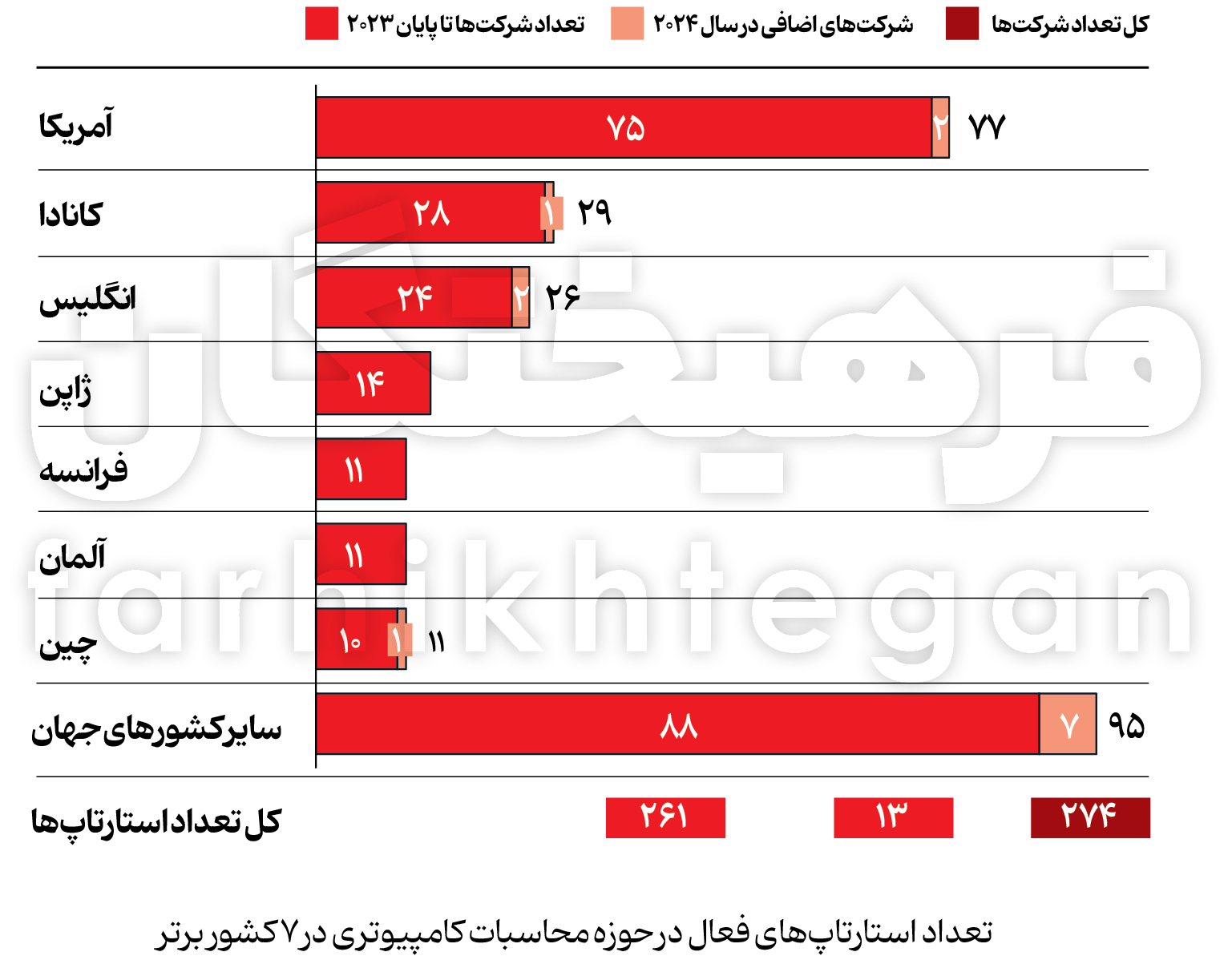 با ظهور مراکز فعال در فناوریهای کوانتومی در آسیا و خوشههای در حال رشد در آمریکا، استارتاپها درون خوشهها تجمیع میشوند. در این بین، آمریکا با 77 استارتاپ در حوزه محاسبات کوانتومی با اختلاف زیاد در صدر بالاترین دارنده استارتاپها در این حوزه قرار گرفته است. بعد از آن کانادا با 29 استارتاپ در رده دوم و انگلیس با 26 استارتاپ در رده سوم و ژاپن هم با 14 استارتاپ در رده چهارم جای گرفتهاند. در این بین، فرانسه، آلمان و چین هر کدام با 11 استارتاپ در حوزه محاسبات کوانتومی قرار گرفتهاند. سایر کشورها نیز 95 استارتاپ در این حوزه در اختیار دارند. درمجموع، در دنیا، 274 استارتاپ حوزه محاسبات کوانتومی فعالیت میکنند که 261 استارتاپ تا انتهای سال 2023 شکل گرفتند و 13 استارتاپ هم در سال 2024 ظهور کردند.