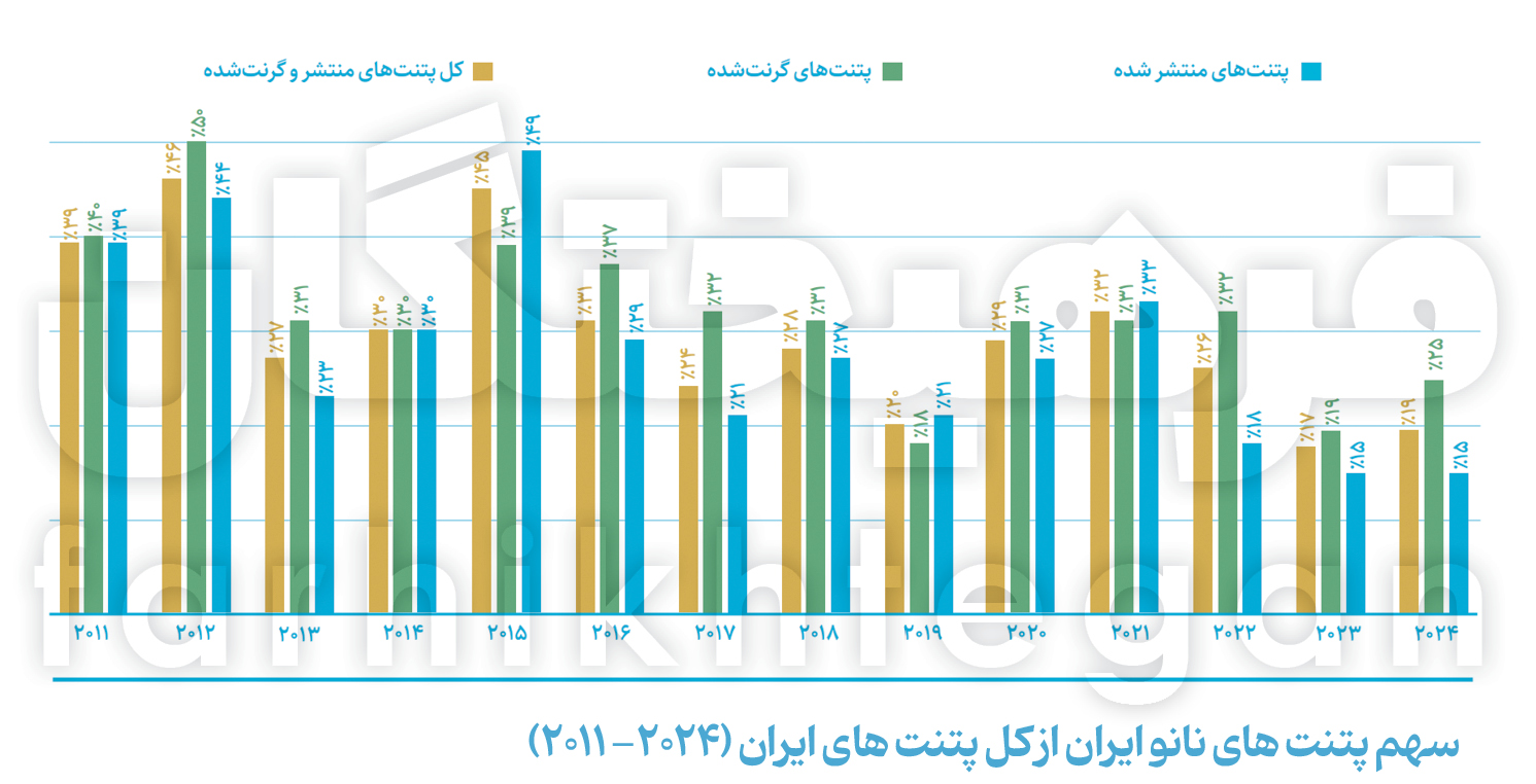 طبق آخرین گزارشها تا پایان سال 2024، ایران 364 اختراع نانویی را در دفاتر ثبت آمریکا و اروپا منتشر کرده. این تعداد تا انتهای سال 2023 به 354 مورد میرسید که رشد حدود 3 درصدی را نشان میدهد. سهم پتنتهای نانویی ایران در دفتر ثبت پتنت آمریکا در سال 2024 به 10 مورد رسید که در مقایسه با 8 پتنت ثبت شده در سال 2023، بیشتر شده است. اما رتبه ایران از منظر تعداد پتنتها در 2024 نسبت به 2023 بدون تغییر در جایگاه 27 باقی مانده است. نسبت تعداد پتنتها به تعداد مقالات نانویی نشان میدهد که 0.19 پتنت نانو در ازای هر 100 مقاله نانو ثبت شده است. در سال 2024، سهم اختراعات مرتبط با فناوری نانوی ایران از کل پتنتهای ثبت شده در کشور در ادارات ثبت پتنت آمریکا و اروپا حدود 25 درصد اعلام شده که در مقایسه با سهم 17 درصدی در سال 2023 با افزایش 8 درصدی مواجه شده است. سهم پتنتهای نانوی ایران از کل پتنتهای ایران در سال 2024 به 19 درصد رسید که از این بین، 25 درصد از پتنتهای نانویی شامل پتنتهای گرنت شده و 15 درصد از آنها نیز پتنتهای منتشر شده بودند. در ردهبندی جهانی ثبت پتنتهای نانویی، آمریکا با 4501 پتنت در رده نخست و بعد از آن، کره جنوبی با اختلاف زیاد، با 1169 پتنت نانویی در رده دوم جا خوش کرده است. چین و تایوان نیز در ردههای سوم و چهارم قرار گرفتهاند.