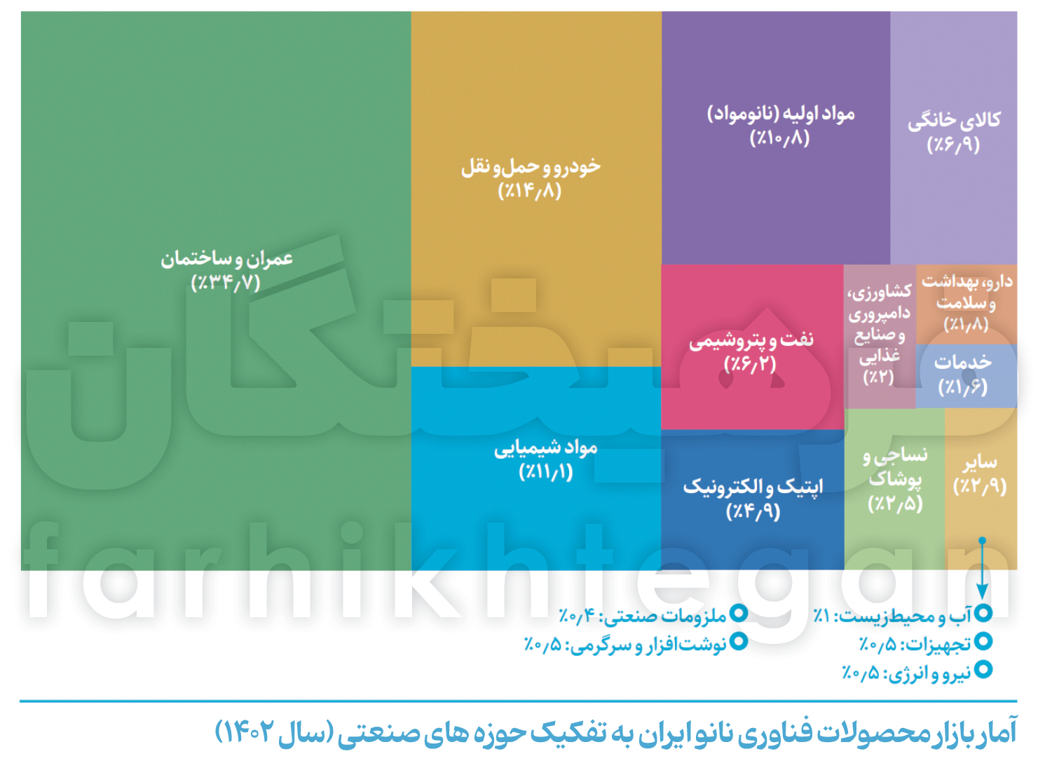 اگر نگاهی به آمار بازار محصولات فناوری نانوی ایران به تفکیک حوزههای صنعتی در سال 1402 بیاندازیم، در میان حوزههای صنعتی، صنعت عمران و ساختمان با سهم 34.7 درصدی و از بین انواع فناوری در حوزه نانو، فناوری نانوپوششها با سهم 41 درصدی در رتبه نخست بازار محصولات نانو قرار داشتهاند. طبق گزارش عملکرد ستاد، در سال 1402 درمجموع، 438 شرکت در حوزه تولید محصول، تجهیزات و خدمات حوزه فناوری نانو در ایران فعالیت داشته و بیش از 80 درصد از حجم بازار فناوری نانوی کشور در اختیار 100 شرکت اول قرار گرفته است. از میان حوزههای مختلف صنعتی، بیشترین تعداد شرکتهای فناوری نانوی ایران در حوزههای عمران و ساختمان، خدمات و نساجی و پوشاک فعالیت میکردند.