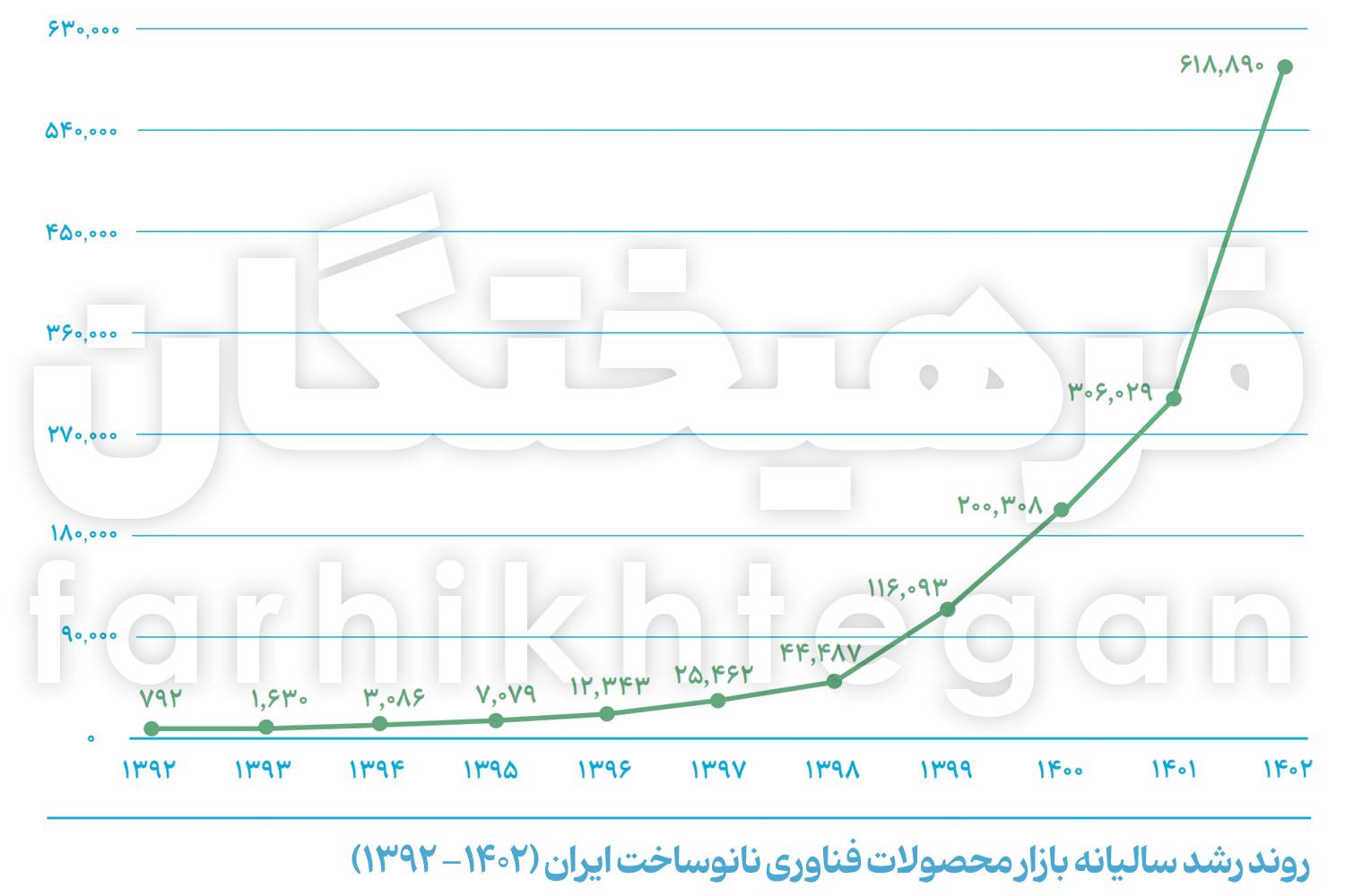 طبق آمار موجود، متوسط رشد سالانه بازار فناوری نانو در ایران از سال 1392 تا 1402 حدود 97 درصد بوده که بیانگر دوبرابر شدن سالانه حجم فروش بازار نانو است. در این بین، بالاترین رقم رشد بازار فناوری نانو مربوط به سال 1399 با رشد 160 درصدی برمیگردد. همچنین رشد بازار فناوری نانو در سال 1402 نیز 102 درصد اعلام شده است که از رقم 30 هزار و 603 میلیارد تومان (1125 میلیون دلار) در سال 1401 به رقمی بالغ بر 61 هزار و 889 میلیارد تومان (1620 میلیون دلار) رسیده است. بازار فناوری نانوی ایران در چهار سال منتهی به سال 1402 به طور متوسط 55.6 درصد رشد فراتر از تورم داشته است. علاوه براین، متوسط چهارساله رشد فروش محصولات نانوی ایران هم در همین بازه زمانی به رشد 97.1 درصدی رسید درحالیکه متوسط چهار ساله نرخ تورم در این بازه زمانی 41.5 درصد عنوان شده است. از کل بازار فروش محصولات نانویی ساخت ایران در سال 1402، سهم 9.2 درصدی صادرات 5 هزار و 710 میلیارد تومانی مربوط به صادرات این محصولات به سایر کشورها بوده که در مقایسه با سهم 6.3 درصدی در سال 1401 با افزایش 3.1 درصدی سهم صادرات محصولات نانویی روبهروست. همچنین، 56 هزار و 179 میلیارد تومان از کل فروش محصولات نانویی نیز سهم فروش بازار داخل است که در مقایسه با رقم 28 هزار و 459 میلیارد تومانی در سال 1401 با رشد حدود 97.40 درصدی مواجه شده که سهم 90.8 درصدی را از آن خود کرده است.