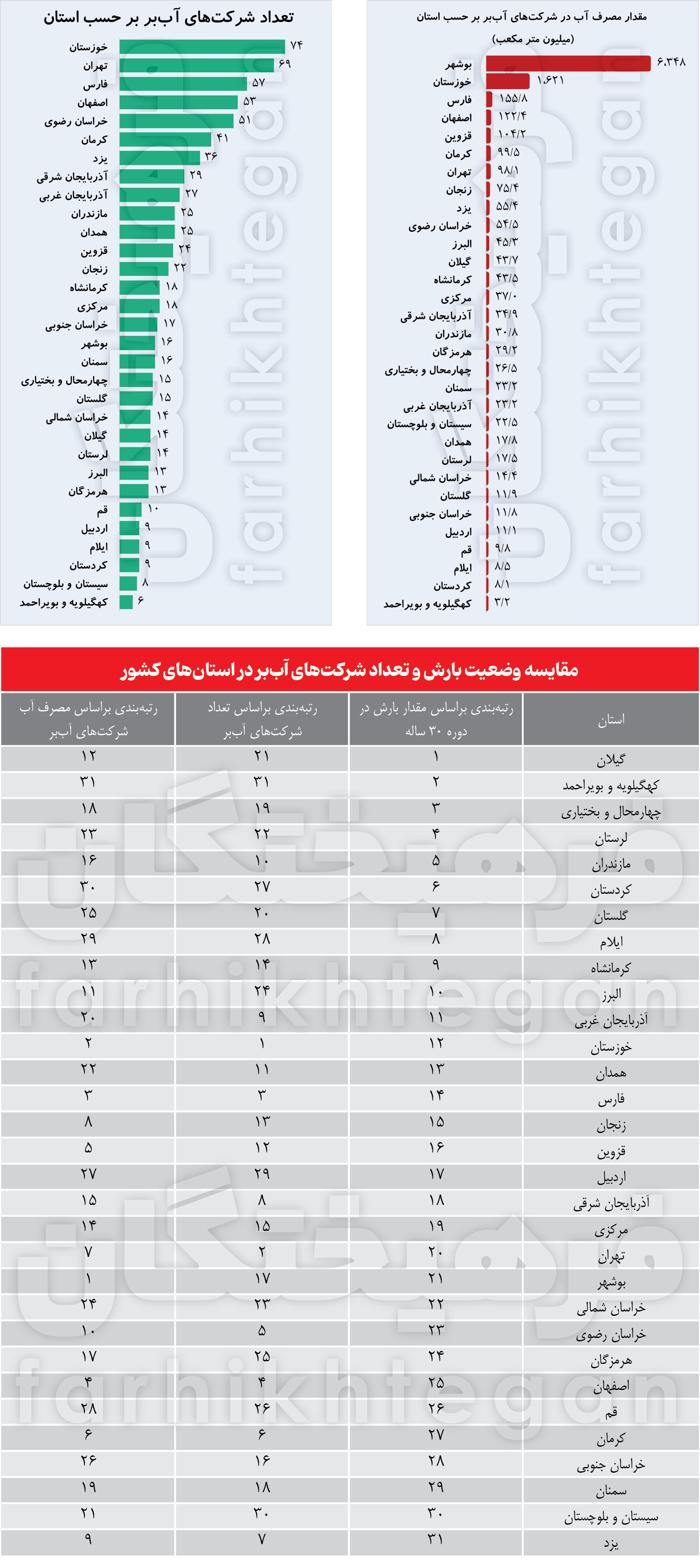 اما بخش جالب توجه این مقایسه مربوط به استانهایی است که دارای شرایط اقلیمی خشک در کشور هستند. استان اصفهان در حالی با وجود میانگین بارش 165 میلیمتر در 30 سال اخیر، رتبه 25 از نظر میزان بارندگی در کشور را دارد که جزء استانها با بیشترین مصرف آب در بخشهای صنعتی است و رتبه 4 را از نظر میزان مصرف آب در واحدهای صنعتی آببر و تعداد واحدهای صنعتی آببر در کشور دارد. افزون بر این، استان خوزستان با وجود آنکه بیشترین واحد صنعتی آببر در کشور را دارد و دومین استان با بیشترین مصرف آب در صنایع است، رتبه 12 را از نظر بارش در کشور دارد. همچنین استان کرمان درحالیکه رتبه 6 را از نظر میزان مصرف و تعداد واحدهای صنعتی آببر در کشور دارد؛ از نظر بارش در رتبه 27 قرار گرفته است. همچنین استان یزد دیگر استانی است که رتبه 31 در میزان بارش را داشته اما در تعداد واحدهای صنعتی آببر رتبه 7 و در میزان مصرف آب در شرکتهای آببر در رتبه نهم قرار دارد.