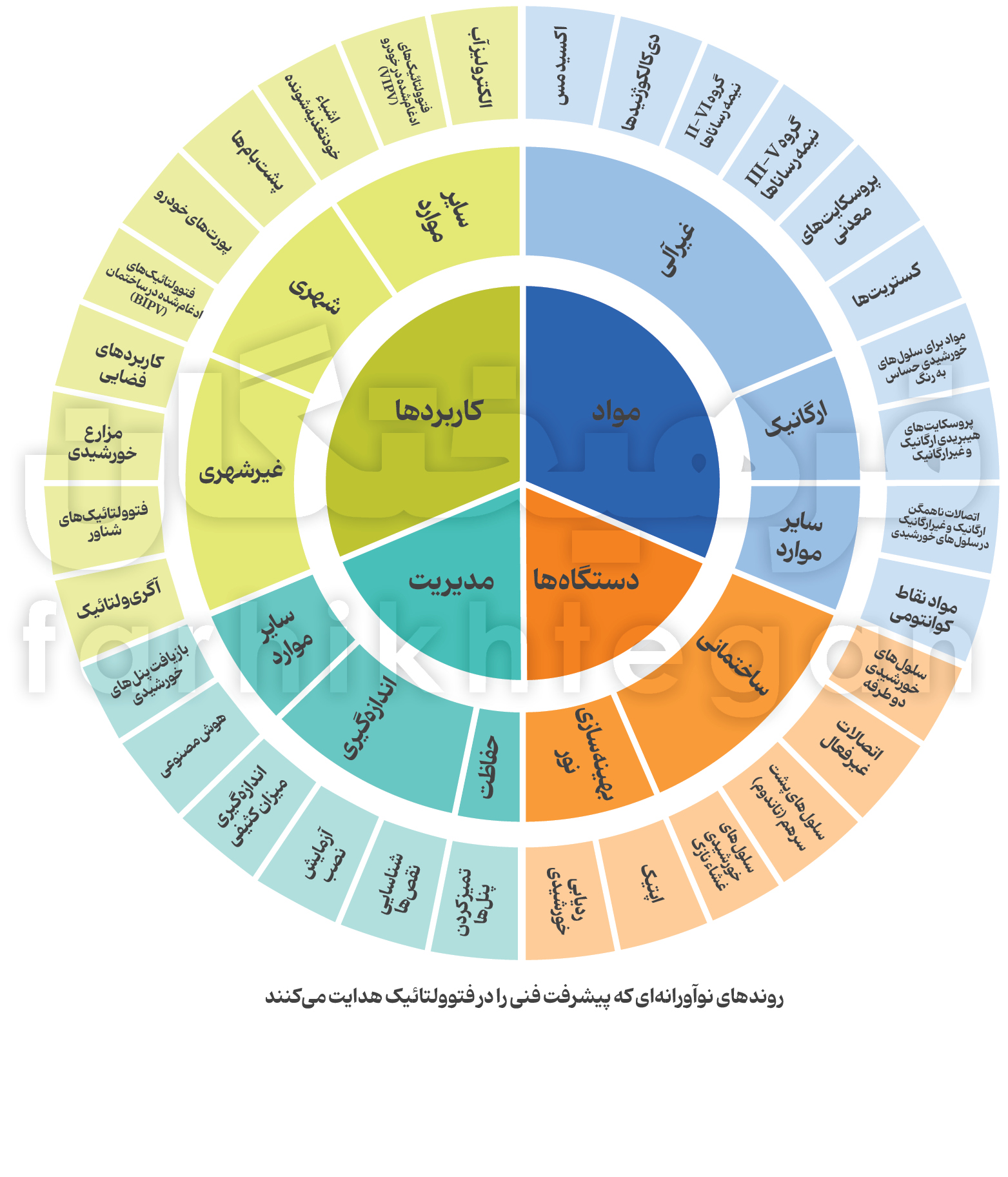 فناوریهای فتوولتائیک با رشد تقاضای جهانی برای انرژی، بهسرعت در حوزههای مواد فتوولتائیک، ساختارهای دستگاهی، مدیریت سیستمی و کاربردهای عملیاتی متحول میشوند. دراینبین، بیش از 30 فناوری در چهار زیرحوزه اصلی فتوولتائیک تقسیمبندی میشوند که در نهایت منجر به بهبود دستگاههای فتوولتائیک شده و کاربردهای متنوع آن هم در توسعه و هم تجاریسازی کشورها مؤثر عمل میکند.