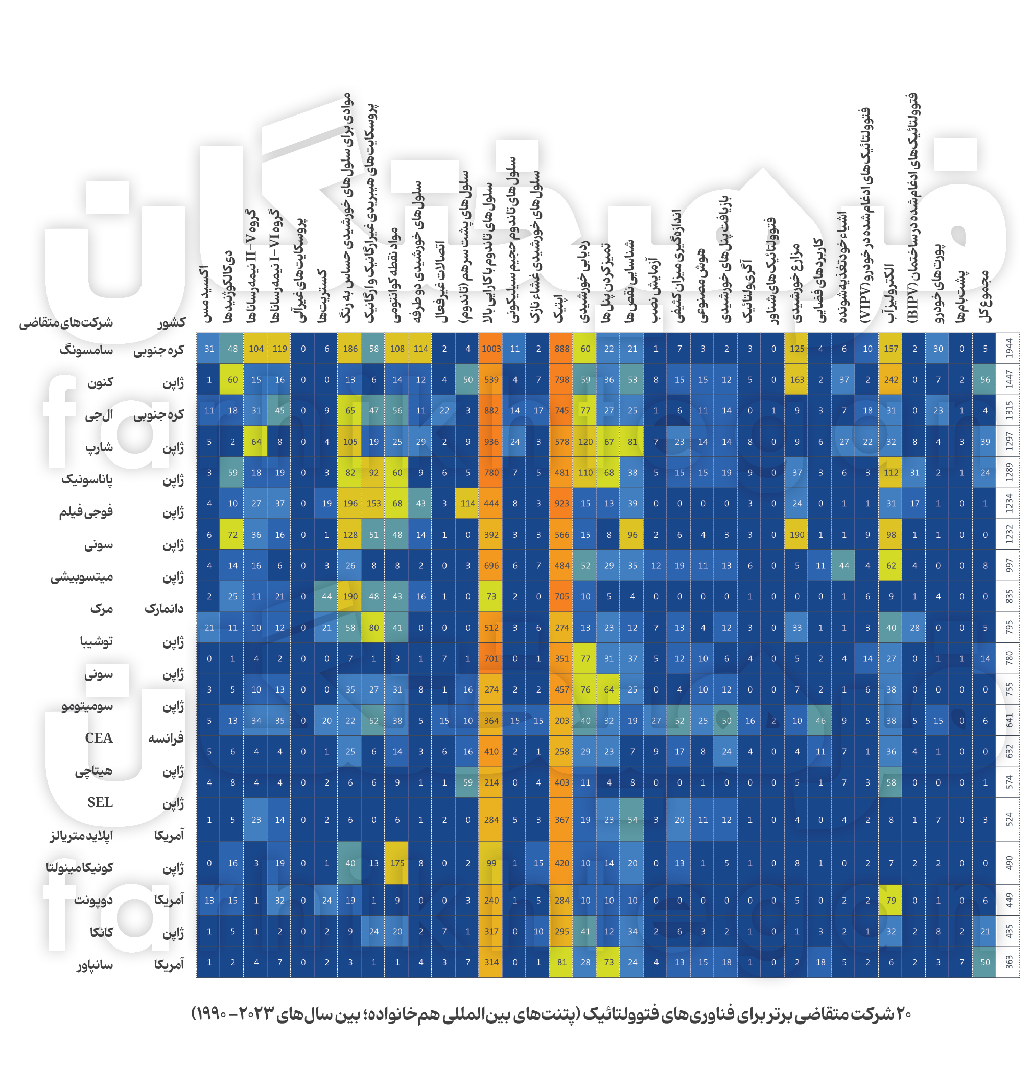 براساس پتنت بینالمللی همخانواده (IPF)، 20 متقاضی برتر در سالهای 2023- 1990 و 20 متقاضی برتر در حوزه فتوولتائیکها حضور داشتند. این متقاضیان بیش از 26.5 درصد از کل IPFها را در این حوزه به خود اختصاص دادهاند. بیشتر این متقاضیان را شرکتهای ژاپنی با 13 شرکت متقاضی پیشتاز در ثبت اختراعات بینالمللی، آمریکا با 3 شرکت متقاضی، کره جنوبی با 2 شرکت متقاضی و آلمان و فرانسه هرکدام با یک شرکت متقاضی تشکیل میدهند. در میان این متقاضیان برتر، تنها یک متقاضی در قالب شرکت حضور نداشته که آن هم سازمان پژوهشی تحت حمایت مالی دولت فرانسه (CEA) بوده است. در میان این متقاضیان برتر، تنها یک متقاضی در قالب شرکت حضور نداشته که آن هم سازمان پژوهشی تحت حمایت مالی دولت فرانسه (CEA) بوده است. از بین 20 شرکت برتر متقاضی، 13 شرکت ژاپنی هستند. اولین شرکت برتر متقاضی، شرکت سامسونگ کره جنوبی است و بعد از آن هم شرکت «کنون» ژاپن، «الجی» کره جنوبی، «شارپ» ژاپن و «پاناسونیک» ژاپن در ردههای دوم تا پنجم قرار گرفتهاند.