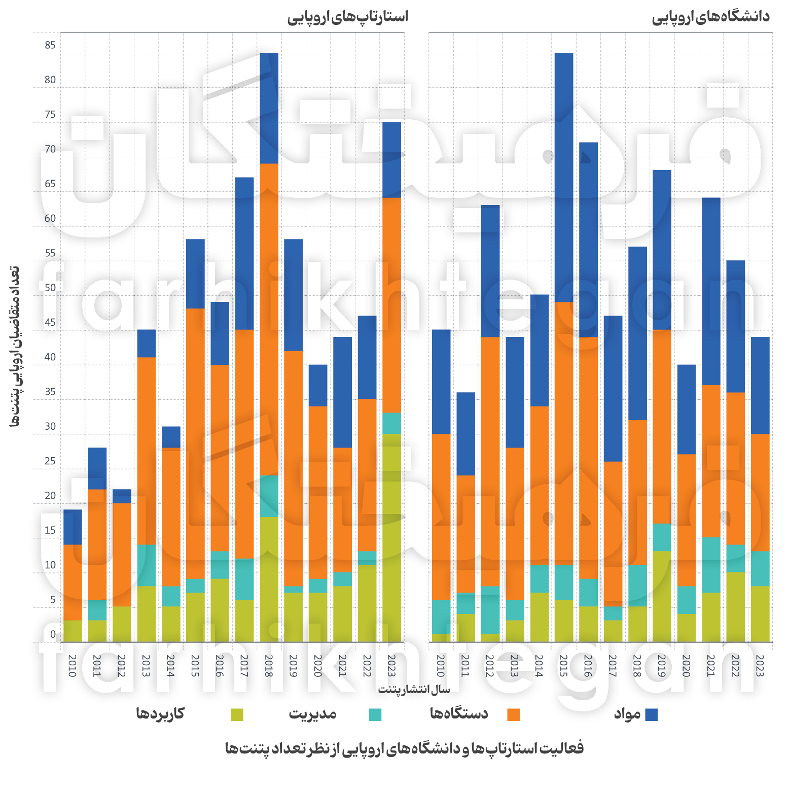 استارتاپها و دانشگاهها روی زیرشاخههای مختلف فناوری در حوزه فتوولتائیک تمرکز داشته و فعالیتهای ثبت اختراع متفاوتی را نشان میدهد. استارتاپها در اروپا عمدتاً بر فناوریهای مرتبط با دستگاههای فتوولتائیکی و پس از آن بر مواد و کاربردهای فتوولتائیک تمرکز دارند، برخلاف دانشگاههای اروپایی که تمرکز زیادی بر دستگاهها و مواد دارند. درحالیکه تعداد ثبت اختراعات توسط استارتاپها هنوز نسبتاً پایین است و نوسانات نسبی مربوطه هنوز زیاد است، سه مرحله قابل شناسایی است. پس از افزایش مداوم تعداد ثبت اختراعات تا سال 2018، فعالیت ثبت اختراع به شدت کاهش یافت، اما بار دیگر شتاب گرفت و به حدود سطح سال 2018 رسید. در سال 2023 که گزارش بر مبنای انتهای این سال منتشر شده، بخش اعظمی از فعالیتهای ثبت اختراع مربوط به اختراعات مرتبط با کاربردهای فتوولتائیک بود. برخلاف استارتاپها، دانشگاههای اروپایی جریان نسبتاً ثابتی از اختراعات مربوط به فتوولتائیک را به خود اختصاص میدهند که باز هم در سطح پایینی نسبت به برخی نوسانات قرار دارند.