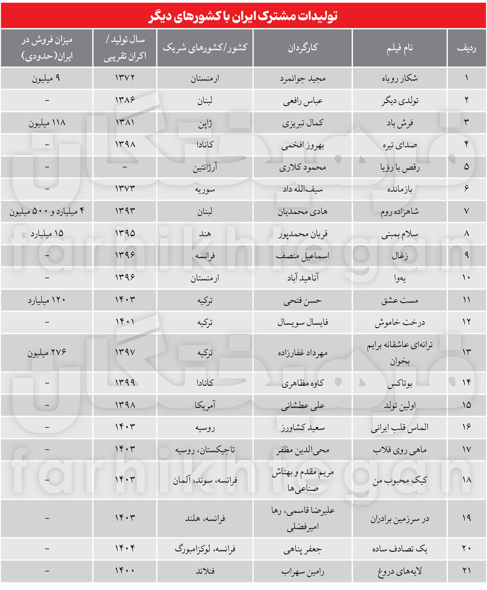 جدولی که در ادامه گزارش بررسی شده، نشان میدهد همکاری ایران با 21 فیلم در قالب تولید مشترک از سال ۱۳۷۲ تا امروز شکل گرفته است. برخی از این آثار، صرفاً در سطح جشنوارهها دیده شدند، اما تعدادی نیز بهطور عمومی در ایران اکران شدند و حتی موفقیتهای اقتصادی نیز بهدست آوردند. اگر بخواهیم بسیار خوش بینانه به این جدول نگاه کنیم، باید به گفتن «خدا را شکر که ما هم در کارنامه سینمای ایران، محصول مشترک داریم» بسنده کنیم. اما در واقع، این میزان آن هم برای بیش از 30 سال، عدد کمی است. مخصوصاً که به جز موارد محدودی، دیگر تولیداتی که با این ویژگی تولید شدند، شامل استقبال عمومی نشدند.